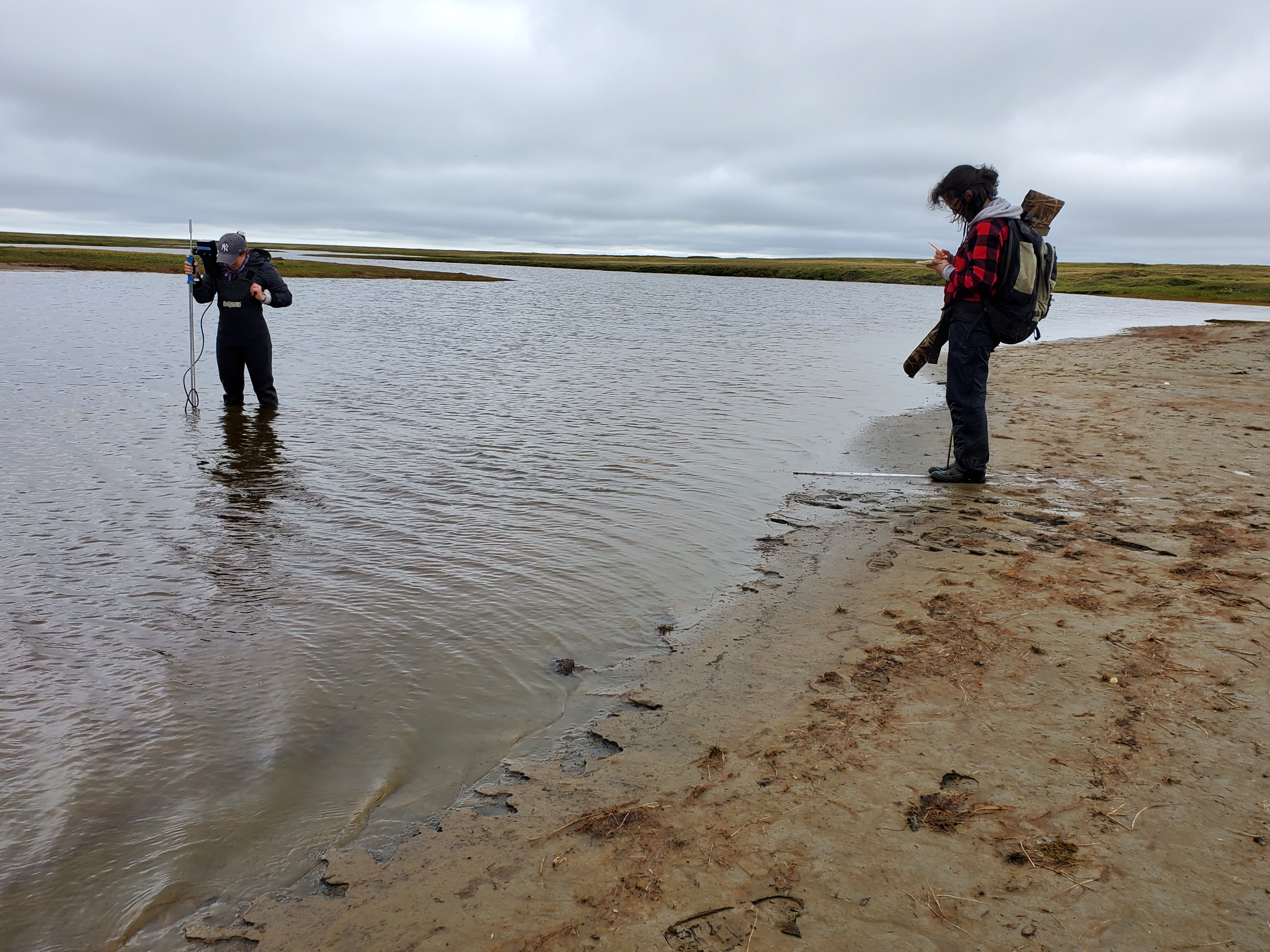 Doctoral student Alina Spera and graduate student Mariana Orejel conduct measurements of a river in the Arctic tundra. Utqiagvik, Alaska.