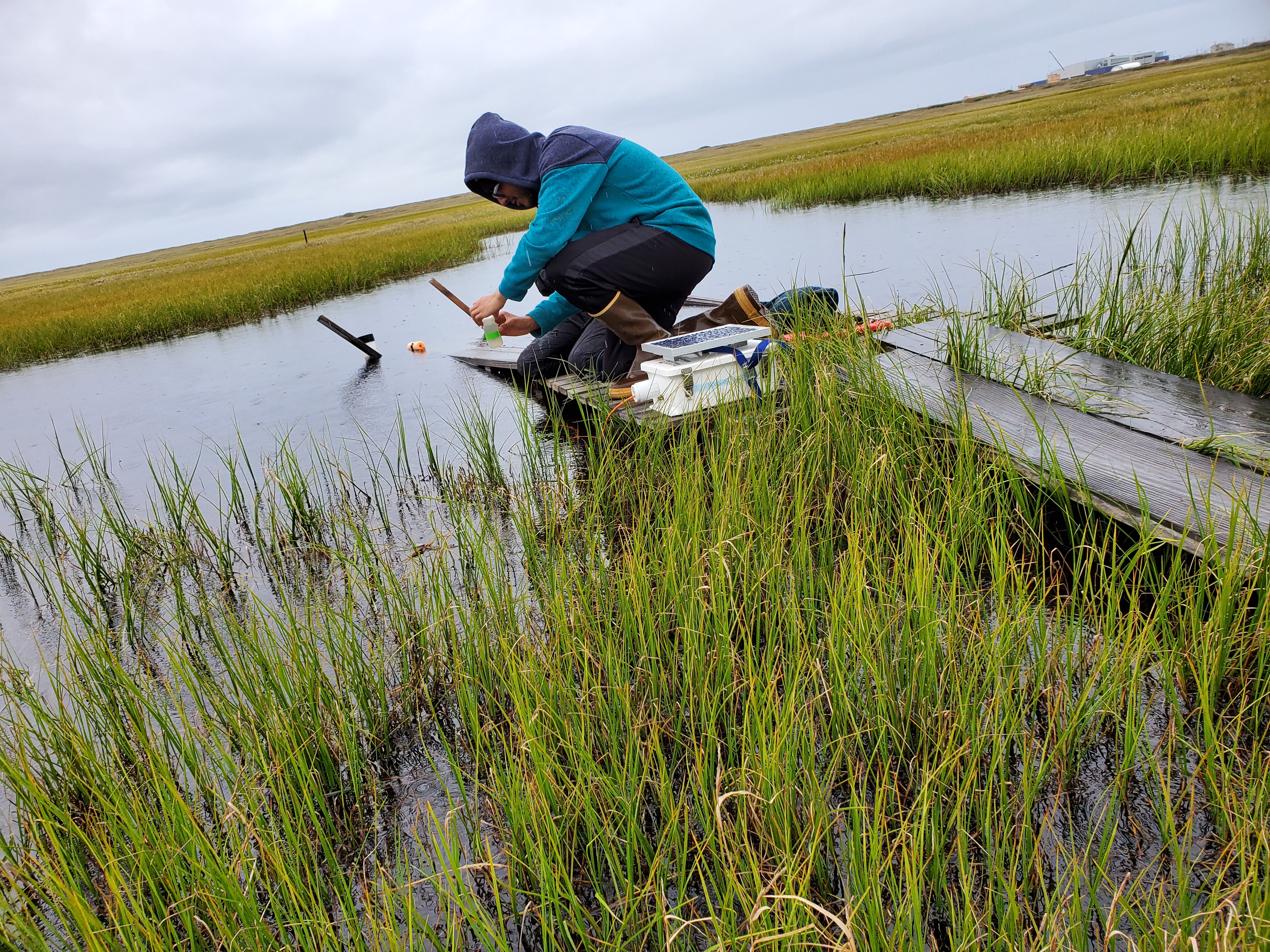 Undergraduate student Hector Dominguez gathers water samples from a pond. Utqiagvik, Alaska.