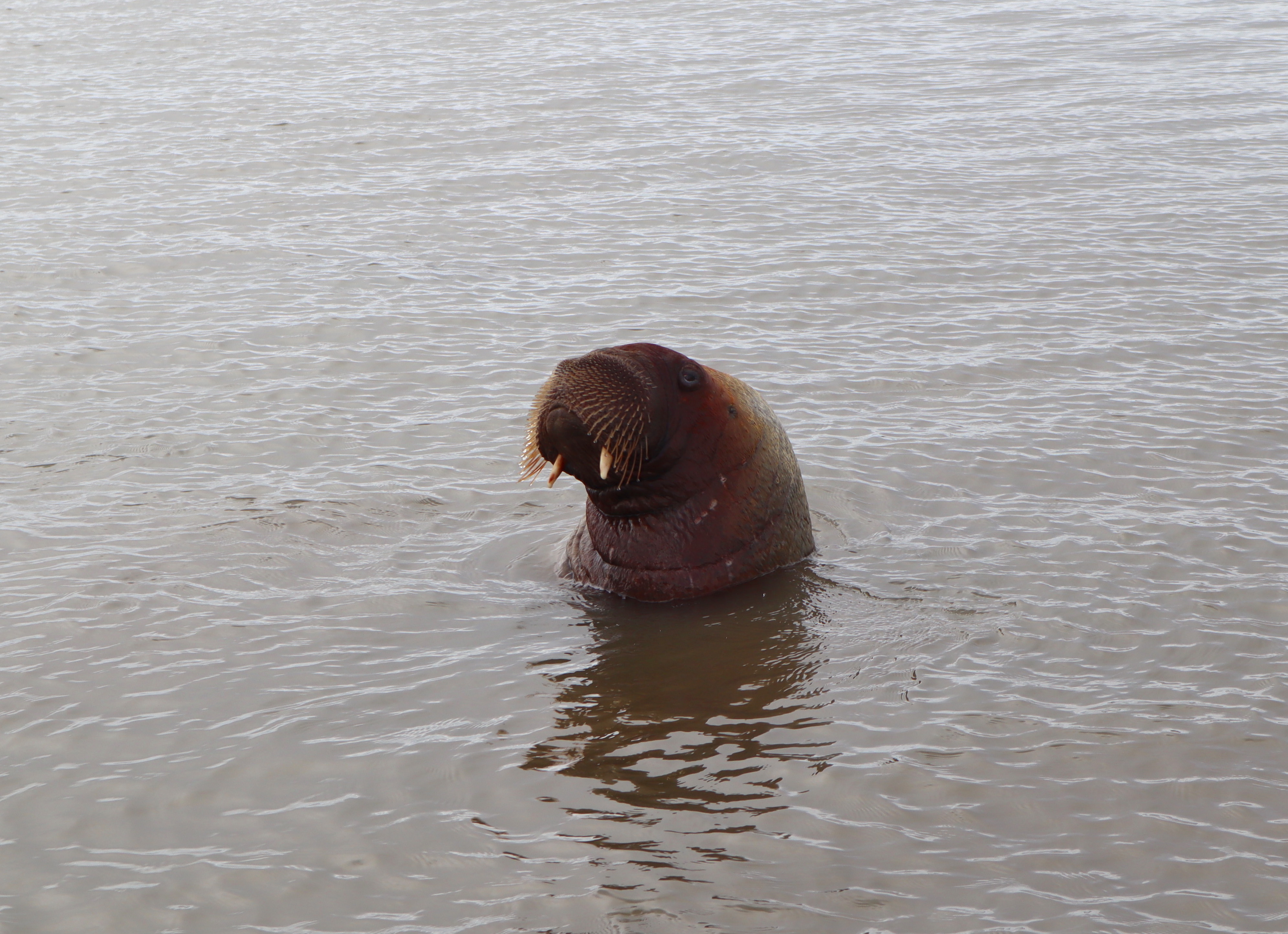A young walrus (Odobenus rosmarus) swims in the Elson Lagoon of the Beaufort Sea near Utqiagvik, Alaska.