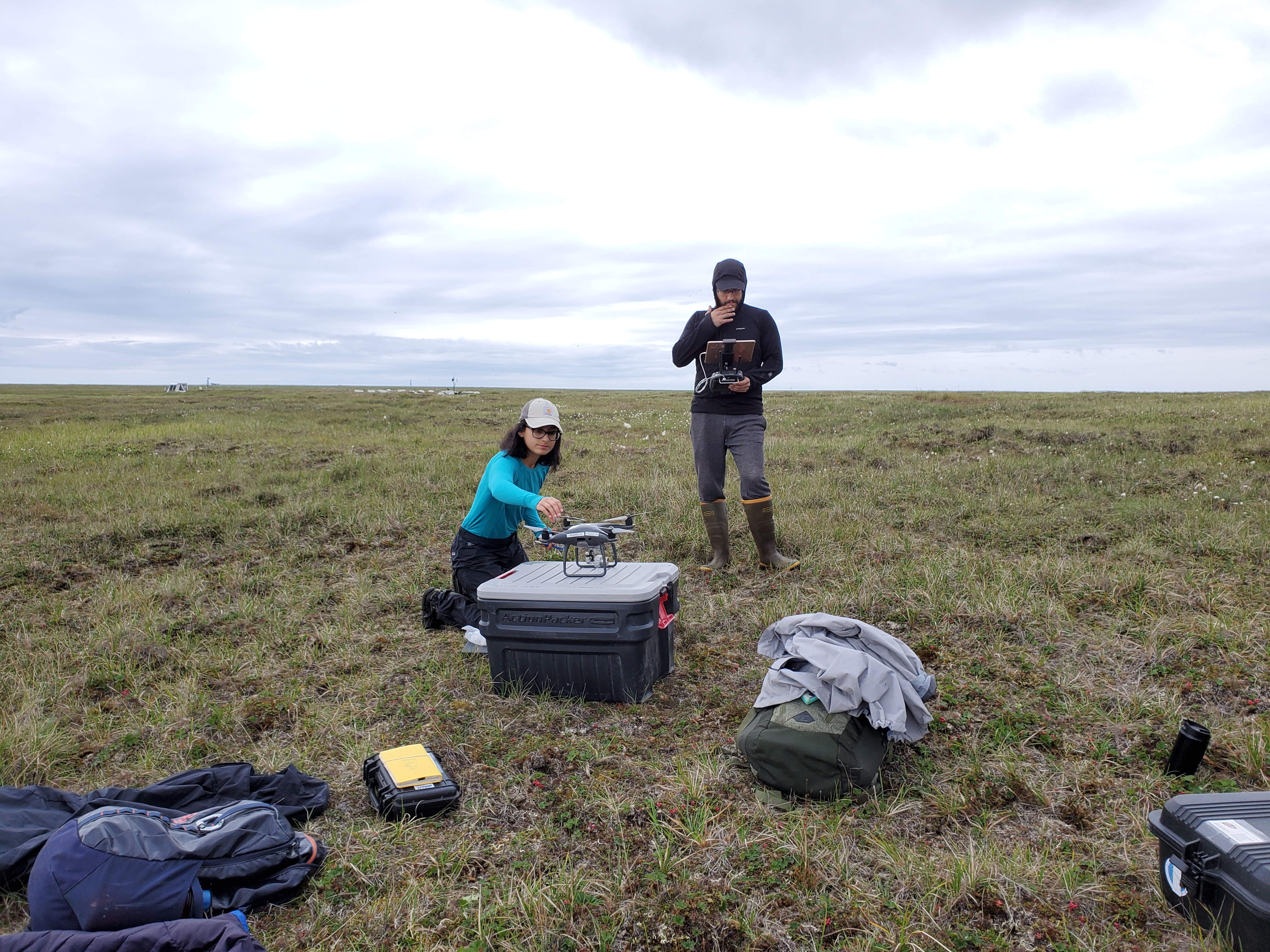 Graduate student Mariana Orejel and Dr. Sergio Vargas prepare a drone for flight. Atqasuk, Alaska.