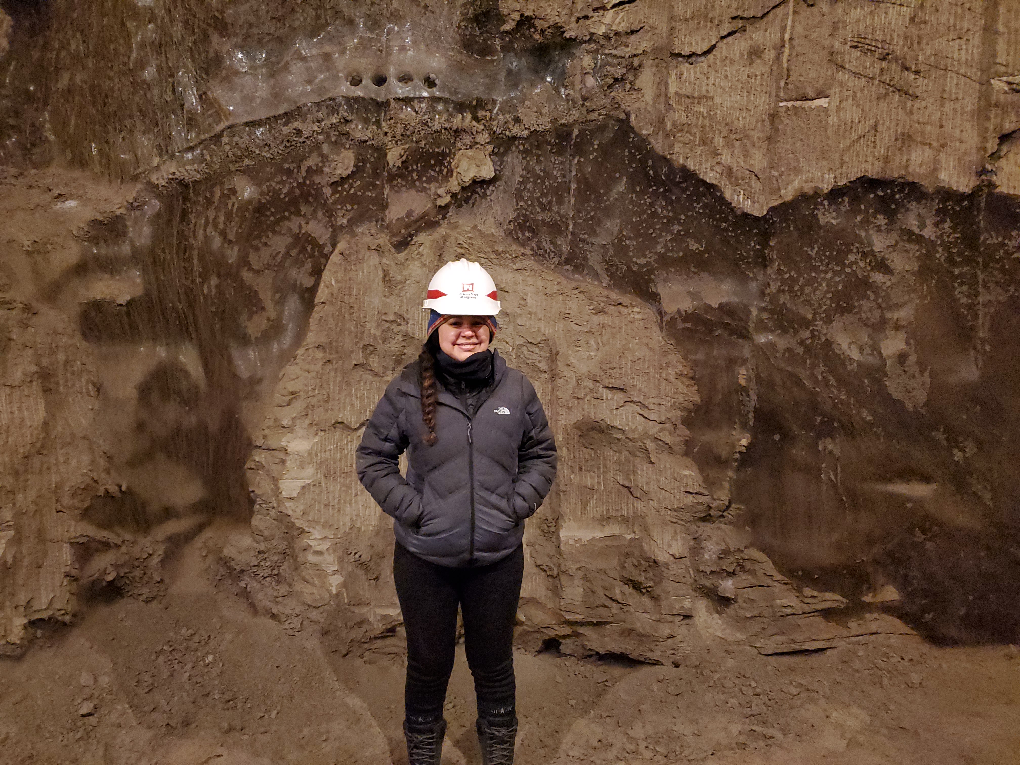 Monica Nuñez poses with an ice wedge inside the CRREL Permafrost Tunnel in Fox, Alaska.