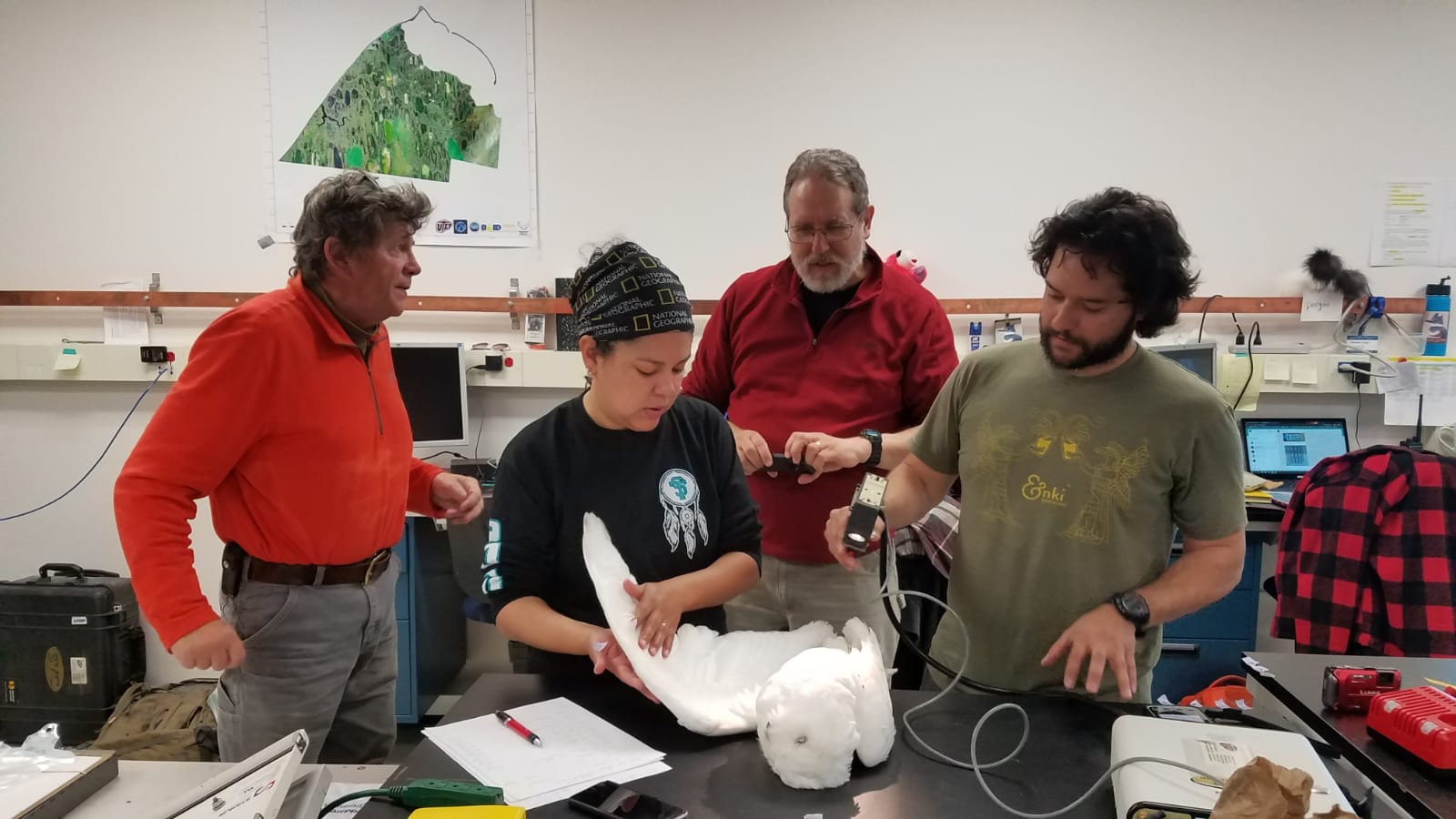 The team conducts a spectral scan of a snowy owl specimen. Left to right: Denver Holt, Monica Nuñez, Dr. Fred Huemmrich, and Dr. Sergio Vargas. Utqiagvik, Alaska.