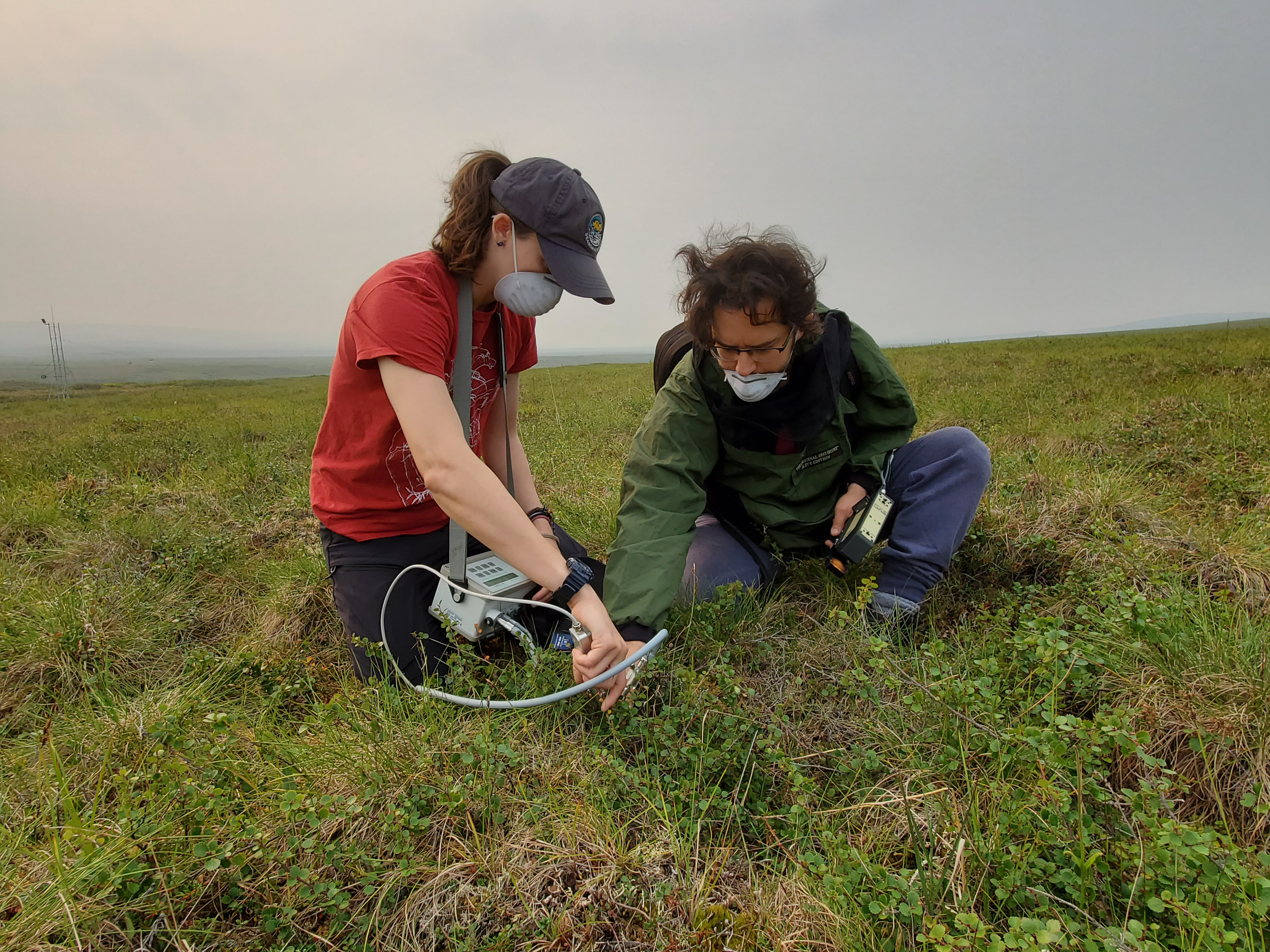 Dr. Sergio Vargas and doctoral student Tabatha Fuson use a photosynthesis yield analyser to gather data in the field. Due to wildfires, researchers had to wear masks out in the field. Toolik Field Station, Alaska.