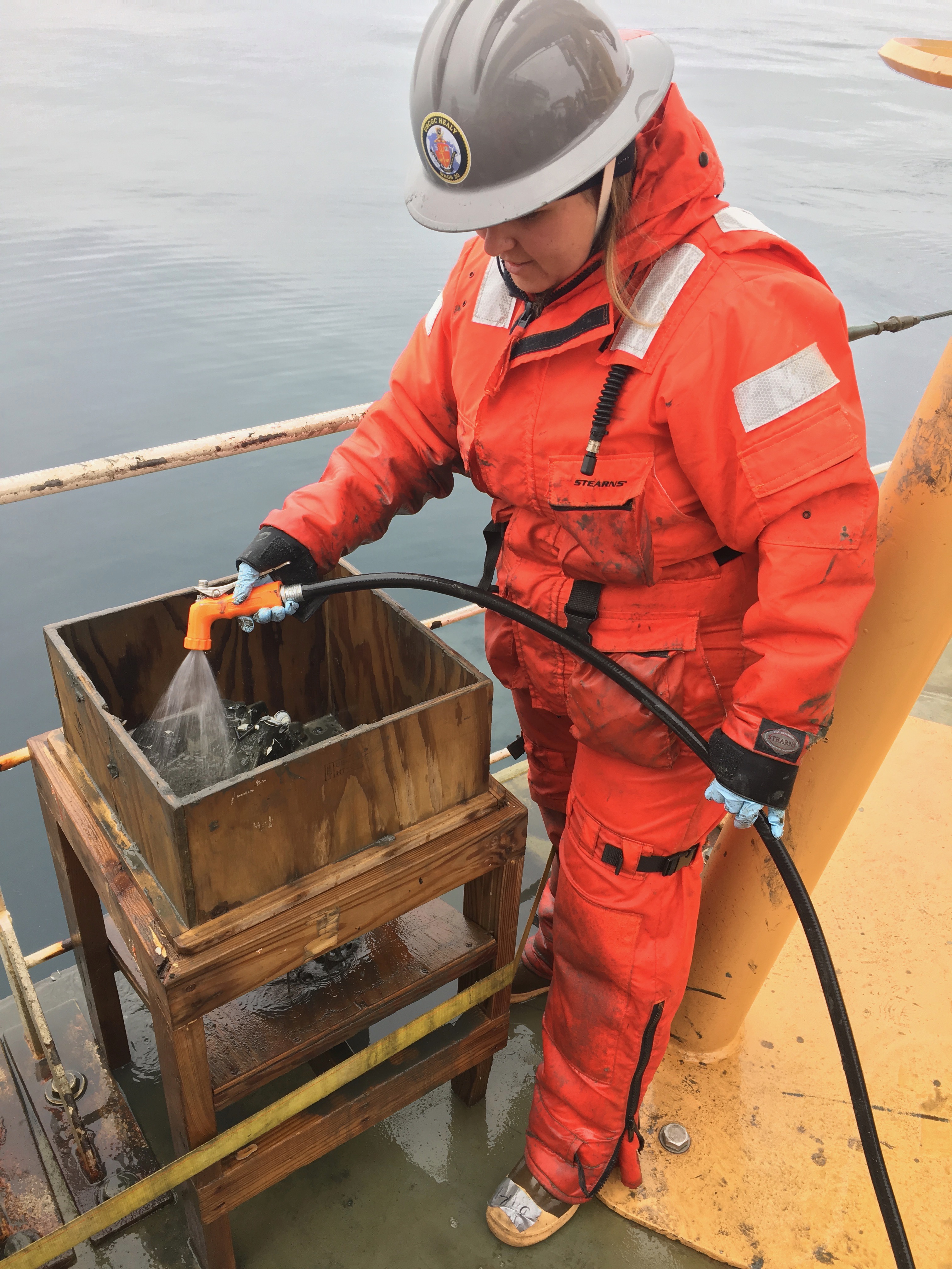 Piper Bartlett-Browne cleans Van Veen grab samples (ocean sediment) in a sieve aboard the Healy. Aboard the USCGC Healy icebreaker in the Bering Sea.