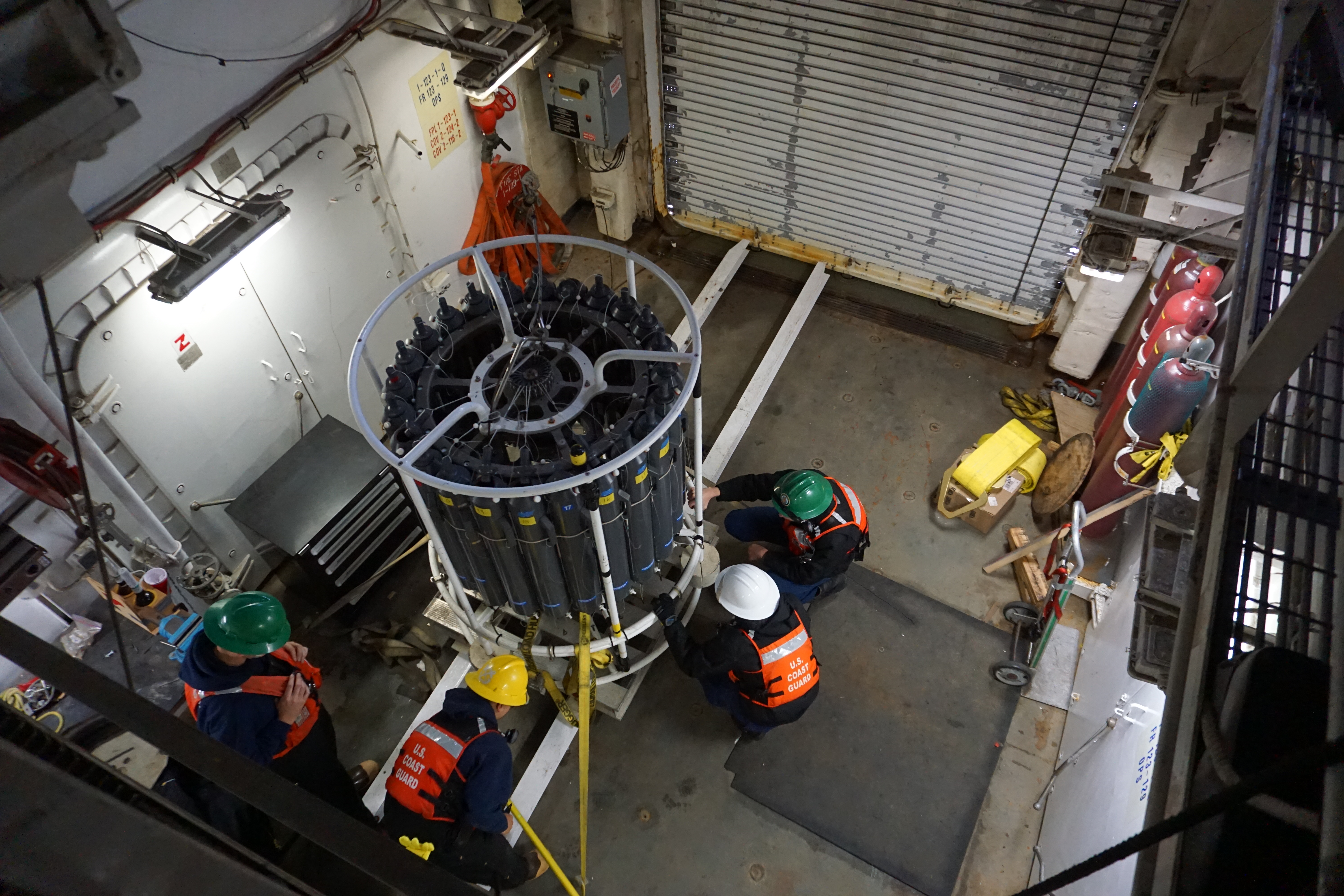 The crew work on preparing the CTD (conductivity, temperature, and depth) instrument. Aboard the USCGC Healy icebreaker in the Bering Sea.