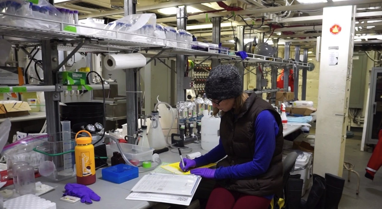 Evie Fachon in the Healy lab working on her harmful algal blooms (HABs) study. Aboard the USCGC Healy icebreaker in the Arctic Ocean.