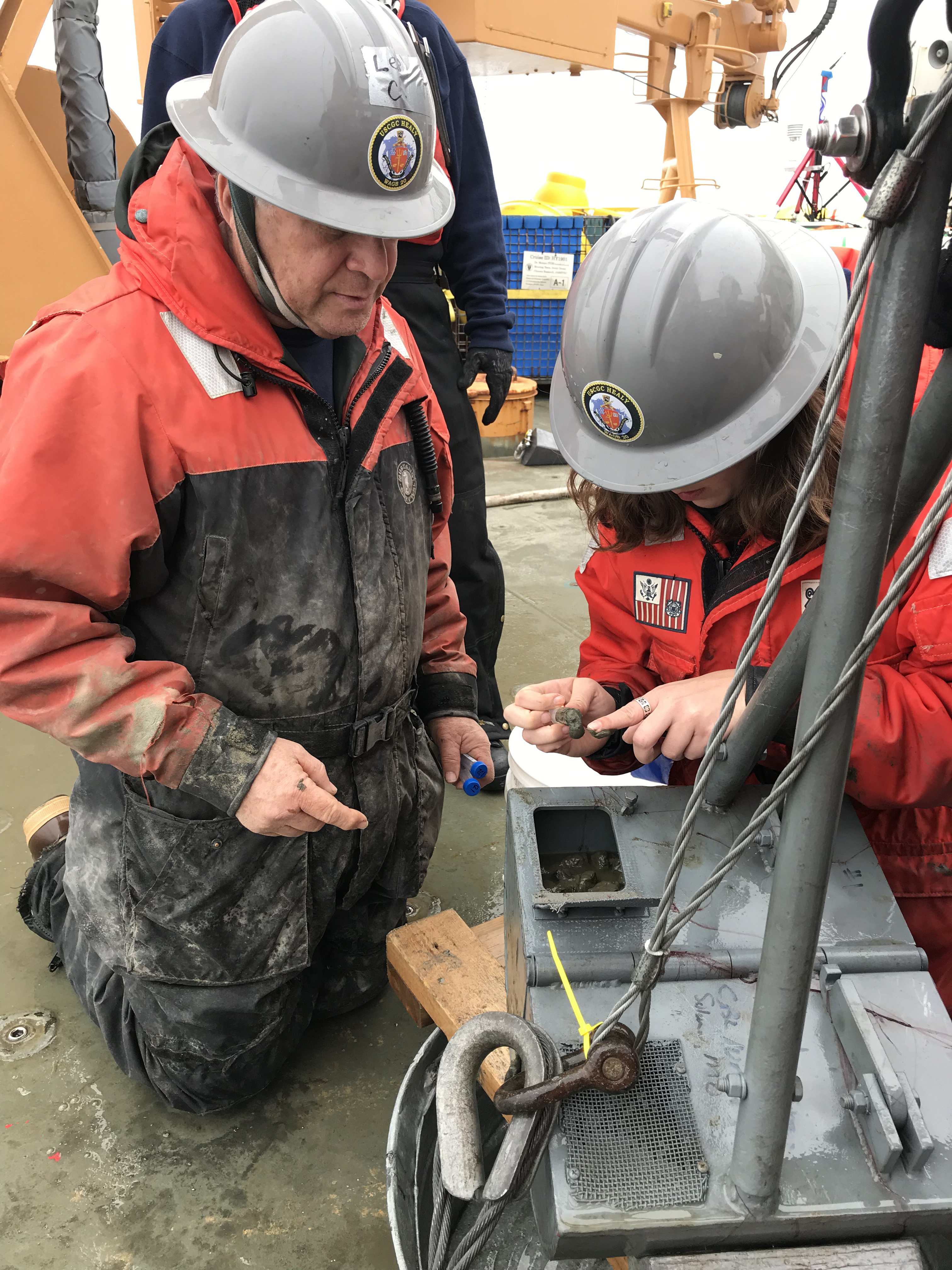 Dr. Lee Cooper and Kelly Kapsar collect surface mud from the trap door of Van Veen grab (an ocean sediment sampler) for the harmful algal blooms (HABs) study. Aboard the USCGC Healy icebreaker in the Beaufort Sea.