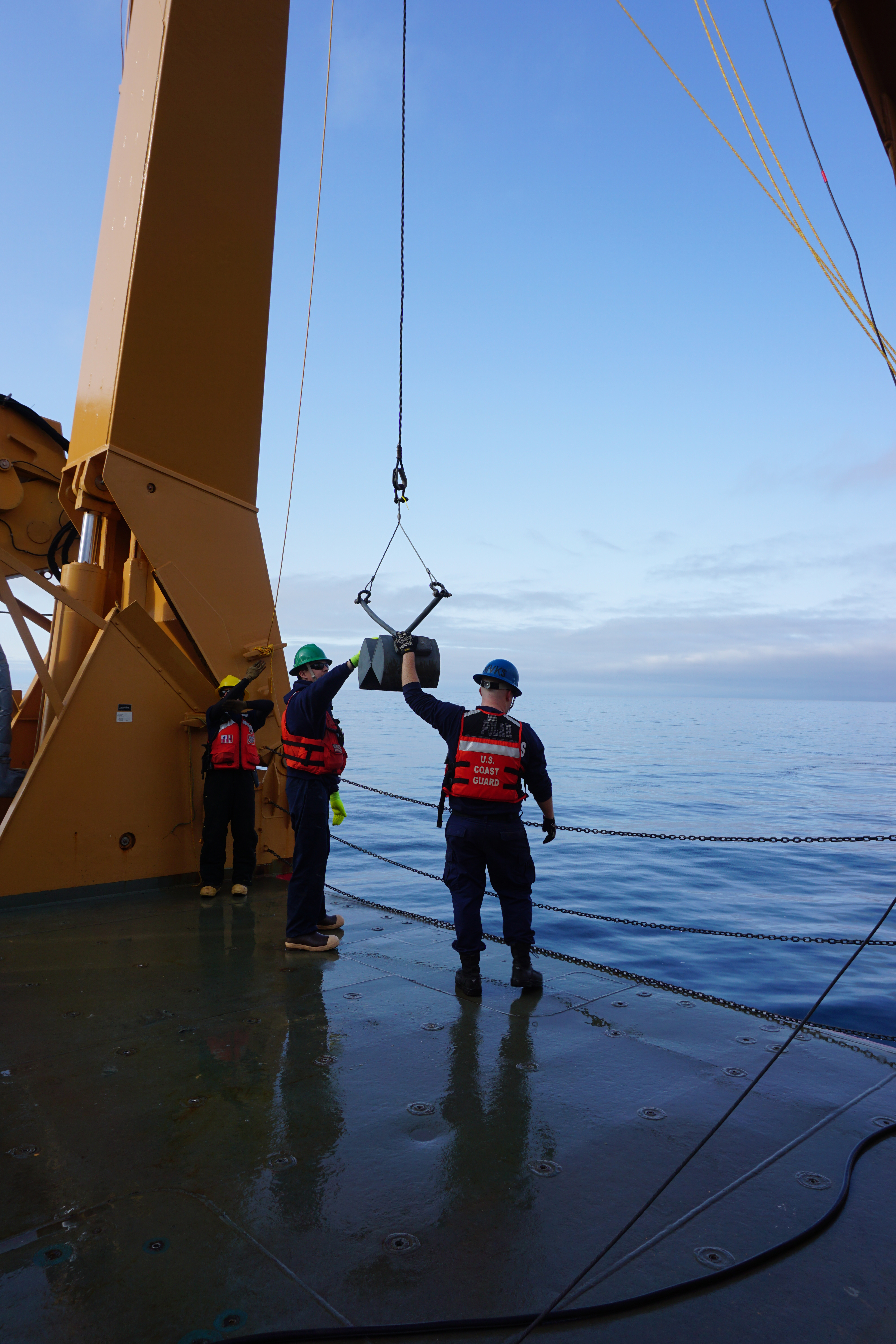 The Coast Guard crew lifts the Van Veen grab (an ocean sediment sampler) off of the ship, to be lowered into the ocean. Aboard the USCGC Healy icebreaker in the Bering Sea.