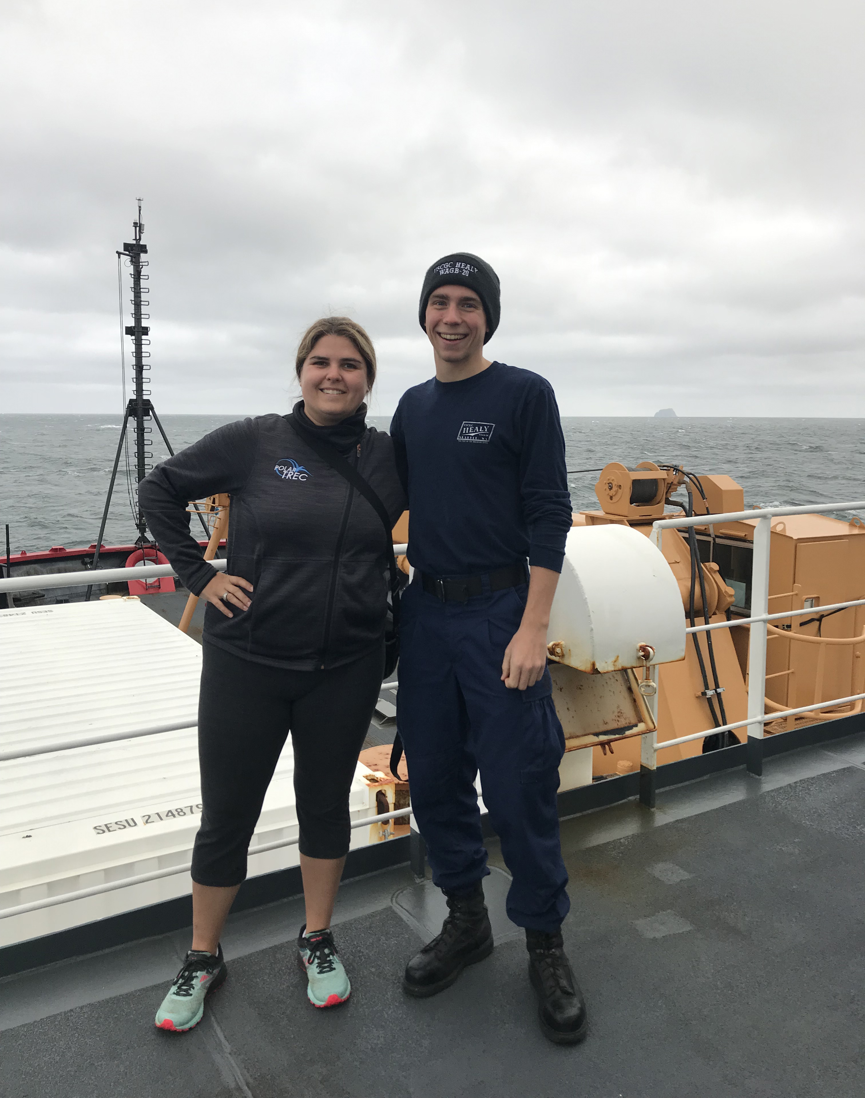 Piper Bartlett-Browne and U.S. Coast Guard crew member Evan Twarog on the bow of the Healy. Both are from New Hampshire. Aboard the USCGC Healy icebreaker in the Bering Sea.