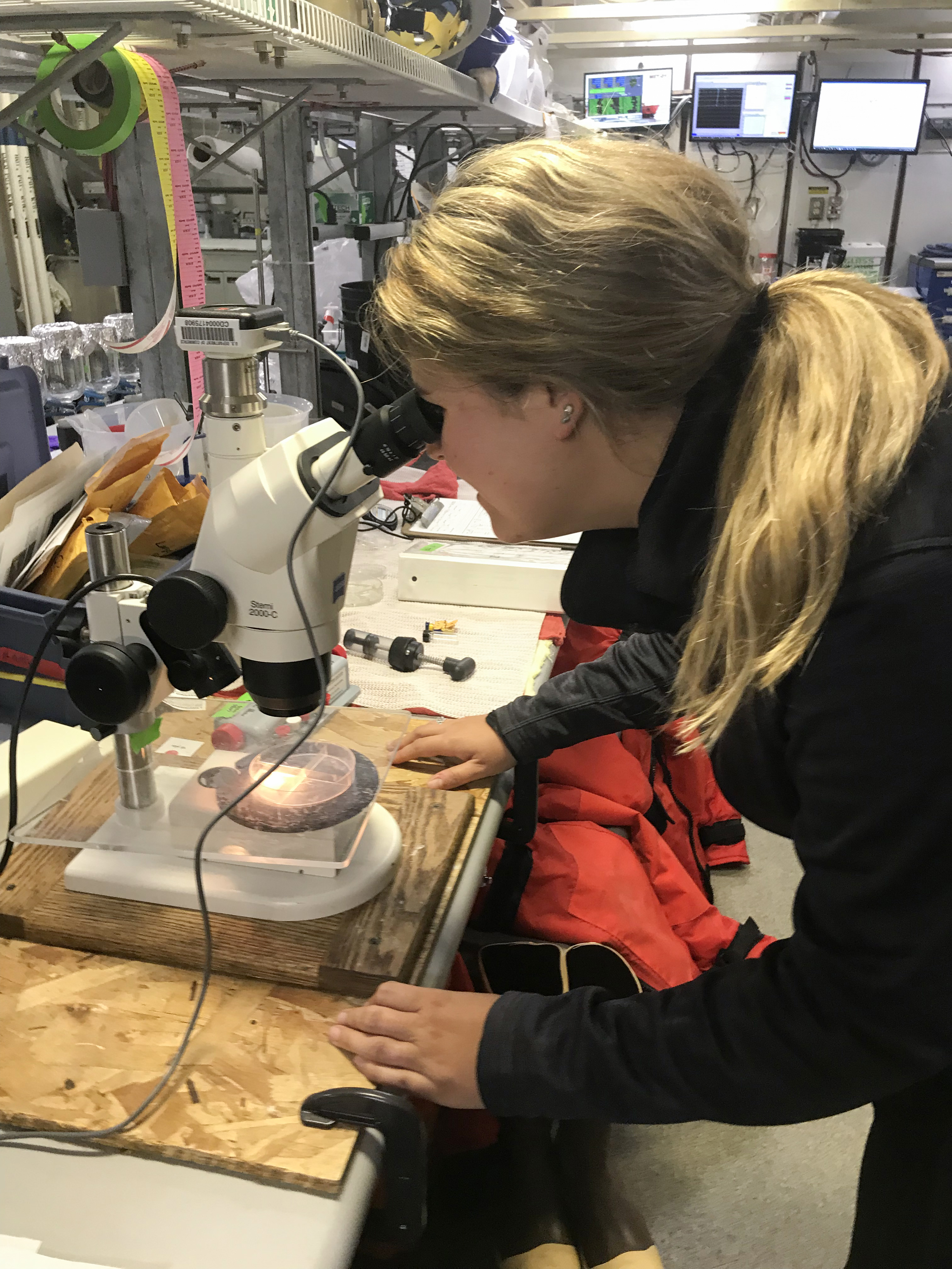 Piper Bartlett-Browne looks at a plankton sample from the bongo tows in the science lab. Aboard the USCGC Healy icebreaker in the Chukchi Sea.