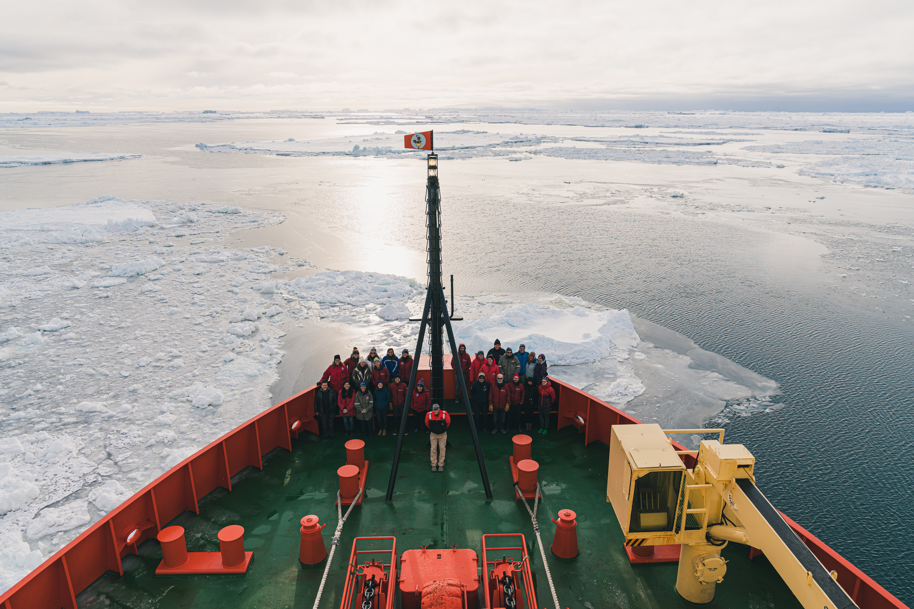 A group shot of the science team on the bow of the R/V Nathaniel B. Palmer icebreaker in the Southern Ocean.