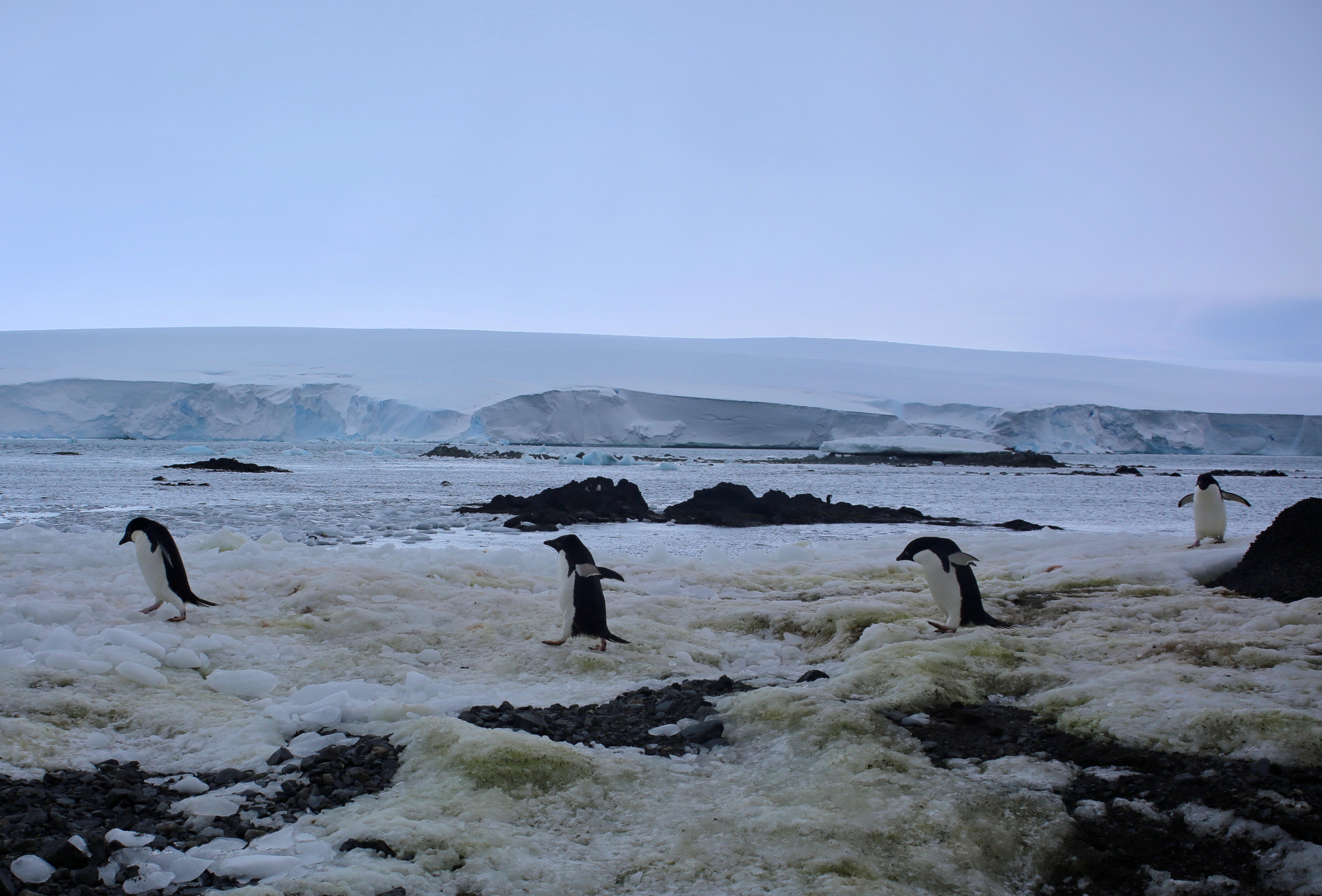 Adélie penguins walk determinedly across the ice on Edwards Island #4, Amundsen Sea, Antarctica.