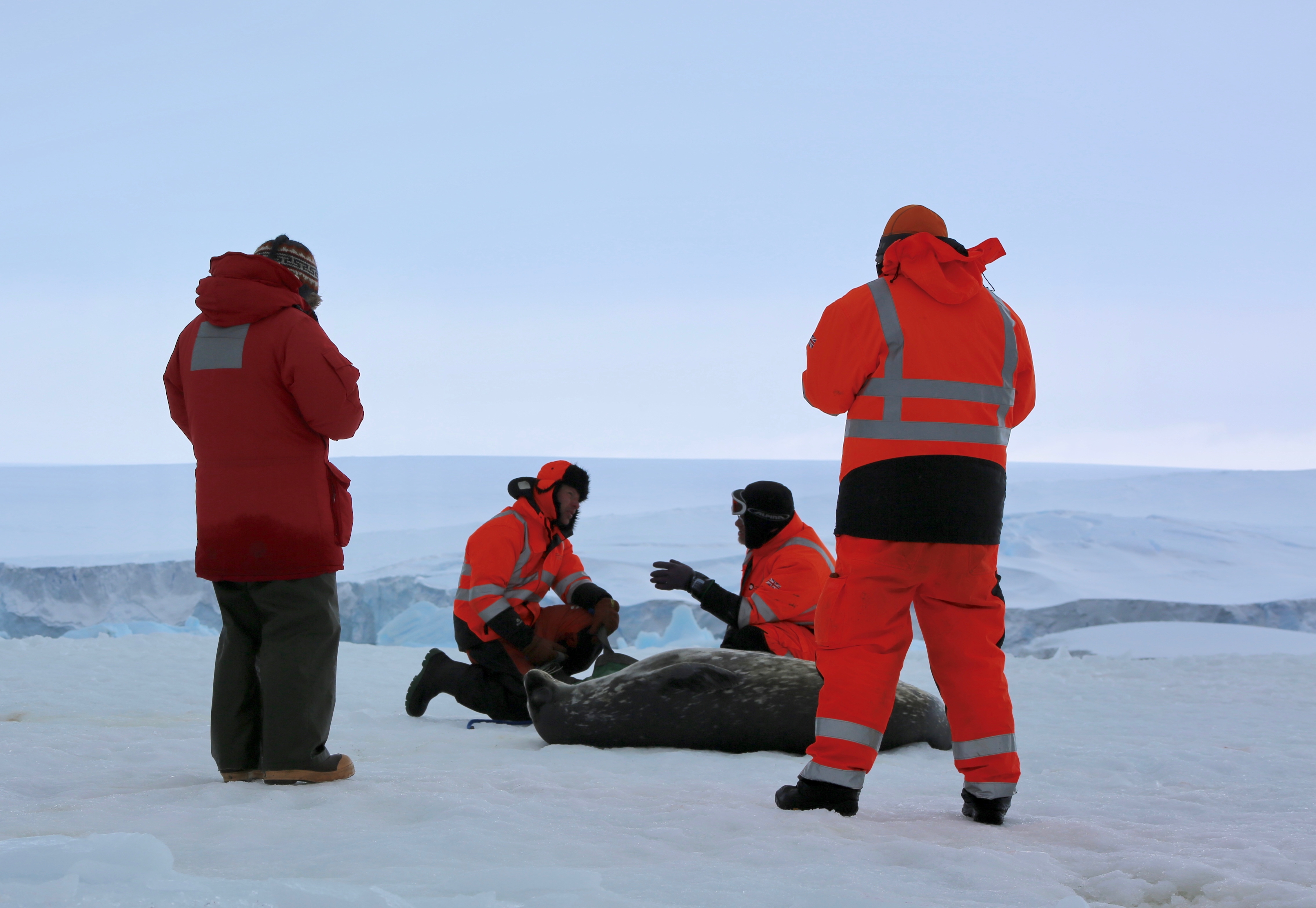 The seal tagging team pause to discuss their strategy for putting a head bag on a Weddell seal (Permit FCO No. 03/2019-20). Edwards Islands, Amundsen Sea, Antarctica.