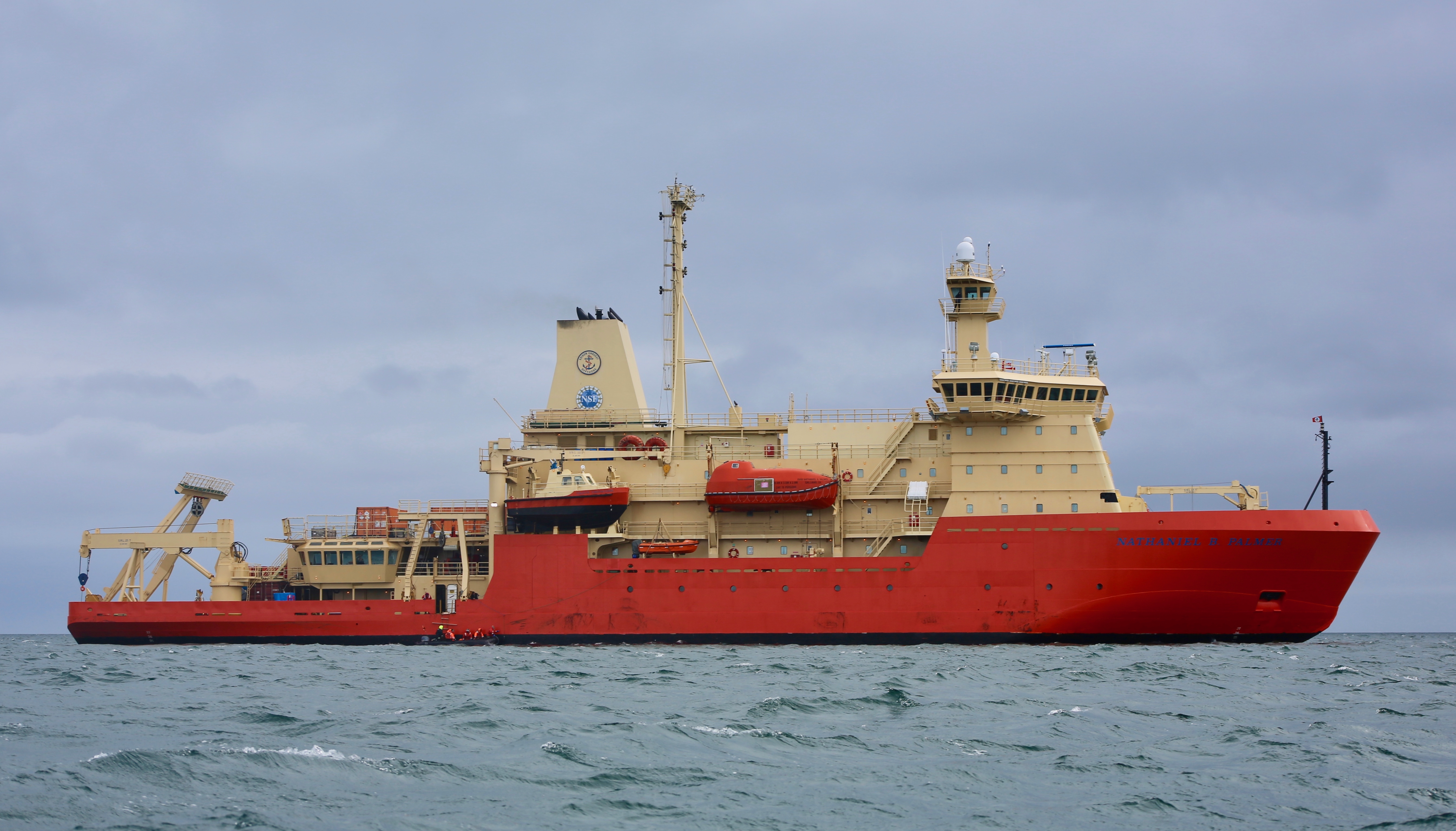 The Nathaniel B. Palmer awaits the return of the seal tagging team. Edwards Islands, Amundsen Sea, Antarctica.