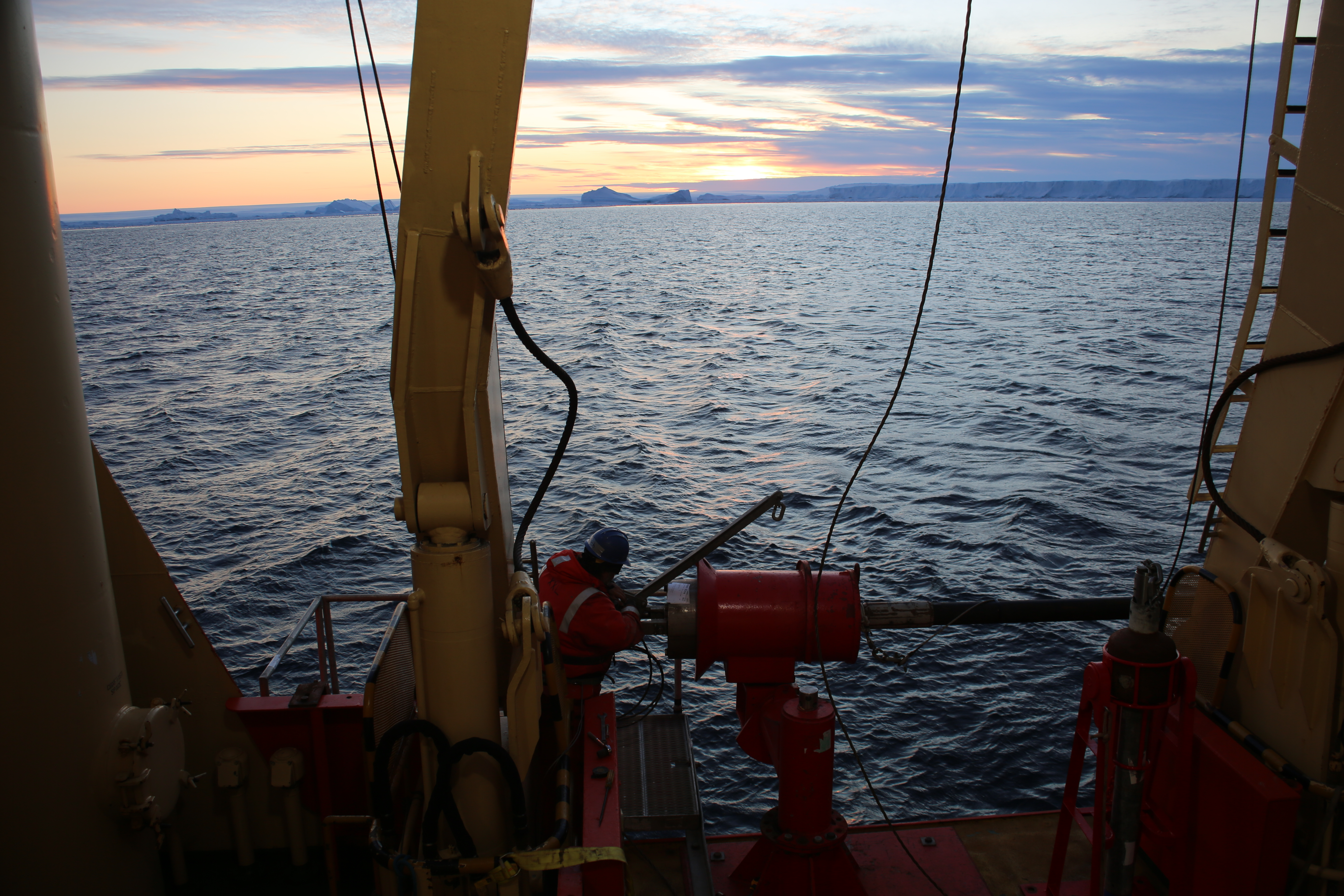 Marine tech Rich Thompson prepares a 40-foot jumbo piston core for deployment. Aboard the R/V Nathaniel B. Palmer icebreaker in the Southern Ocean.