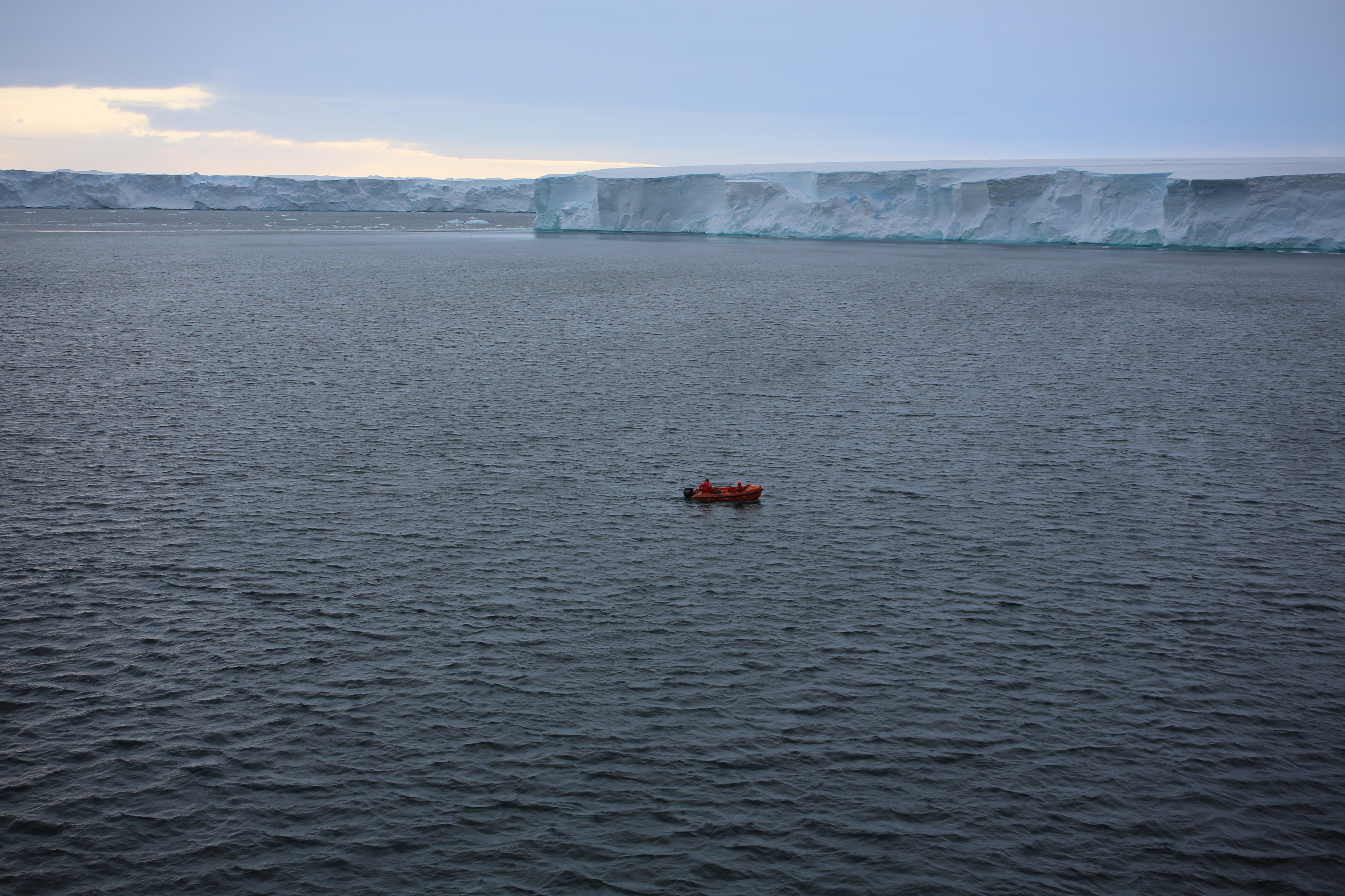 The crew of the Nathaniel B. Palmer takes a zodiac out to conduct a "man overboard" drill in calm waters off the Pine Island Glacier. Aboard the R/V Nathaniel B. Palmer icebreaker in the Southern Ocean.
