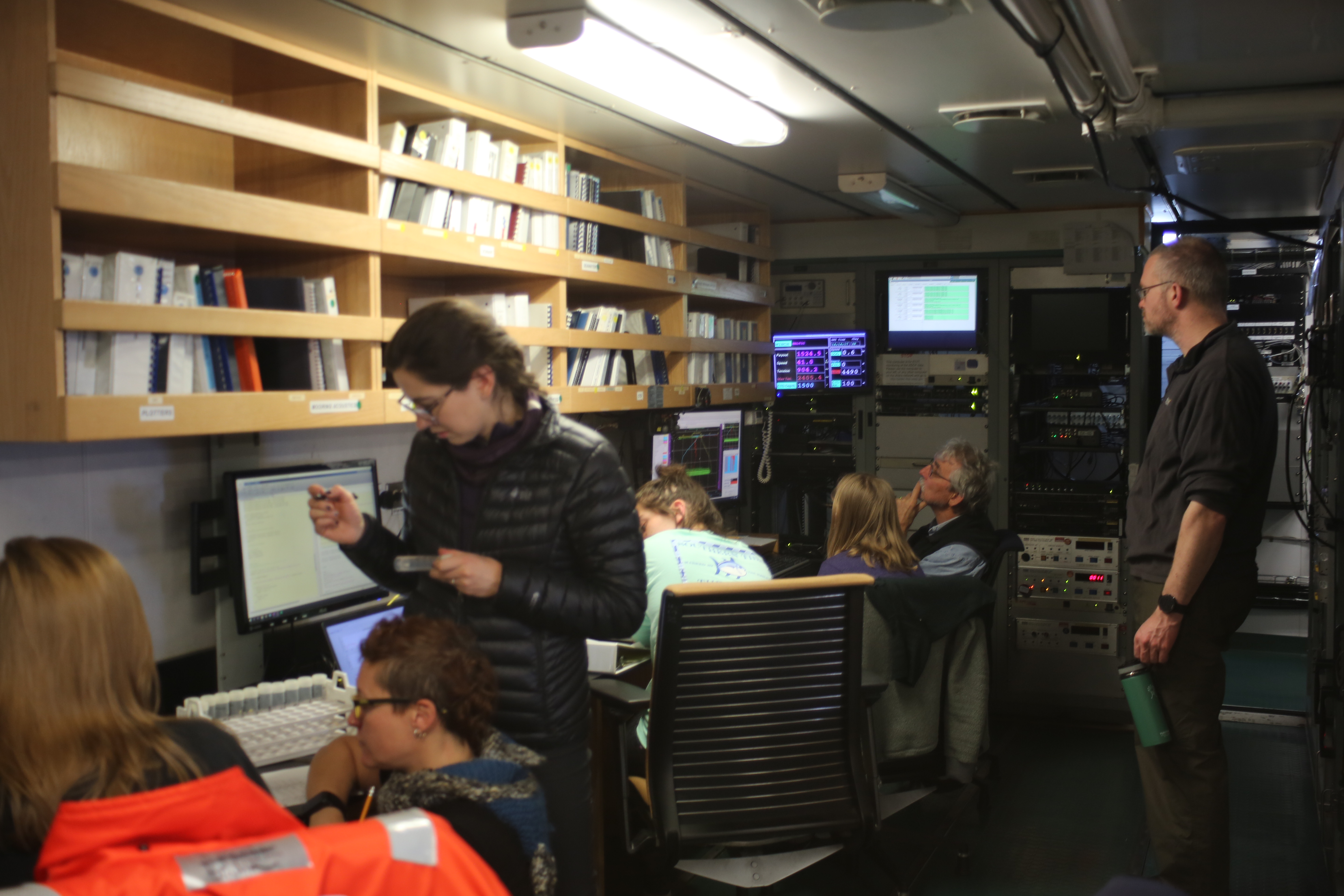 Researchers keep track of the data coming in from the first deployment of the CTD (conductivity, temperature, and depth) array in 2000-meter deep water. Aboard the R/V Nathaniel B. Palmer icebreaker in the Southern Ocean, en route to the Amundsen Sea.