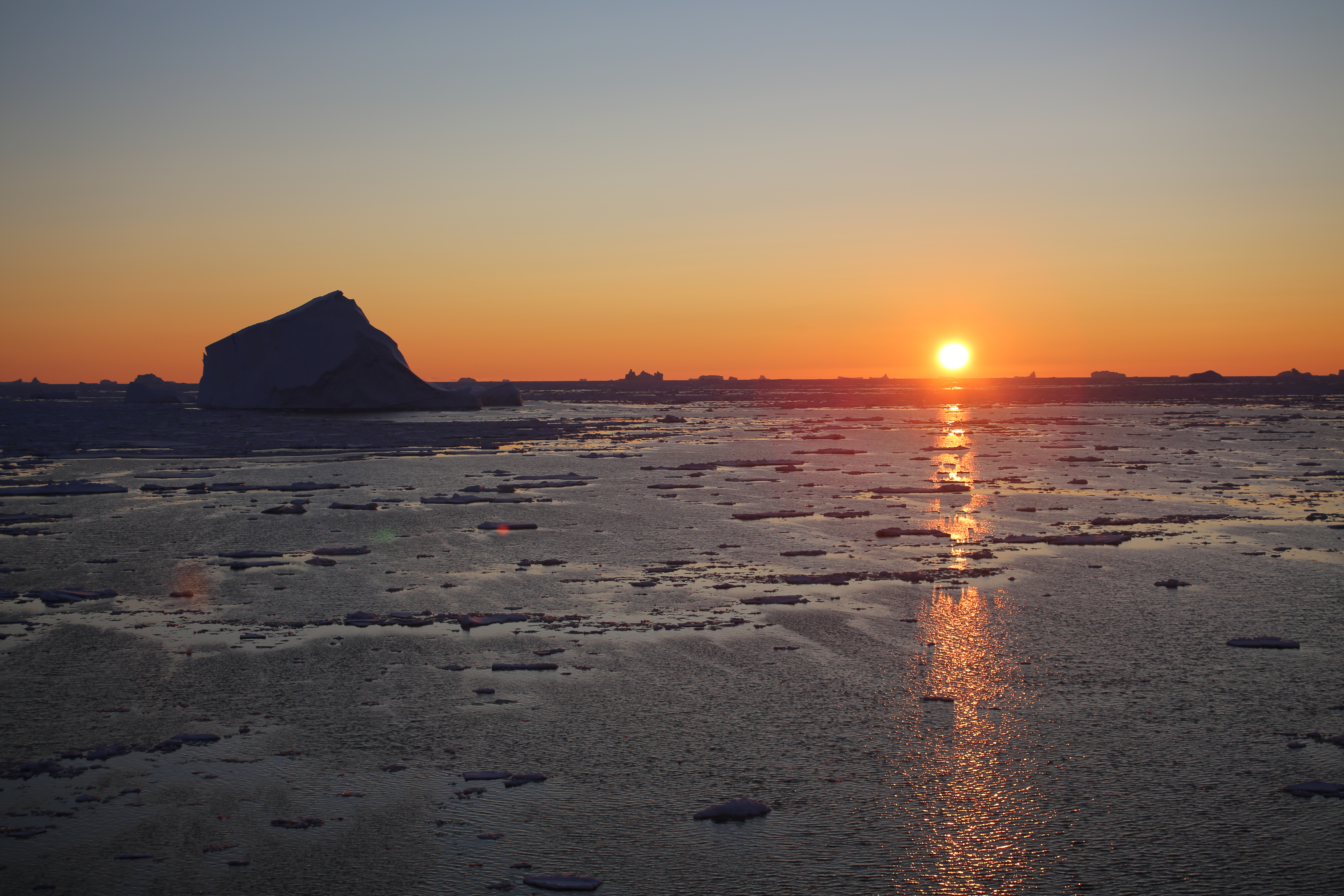 A sunset over the ice off the port deck of the Nathaniel B. Palmer in the Southern Ocean.