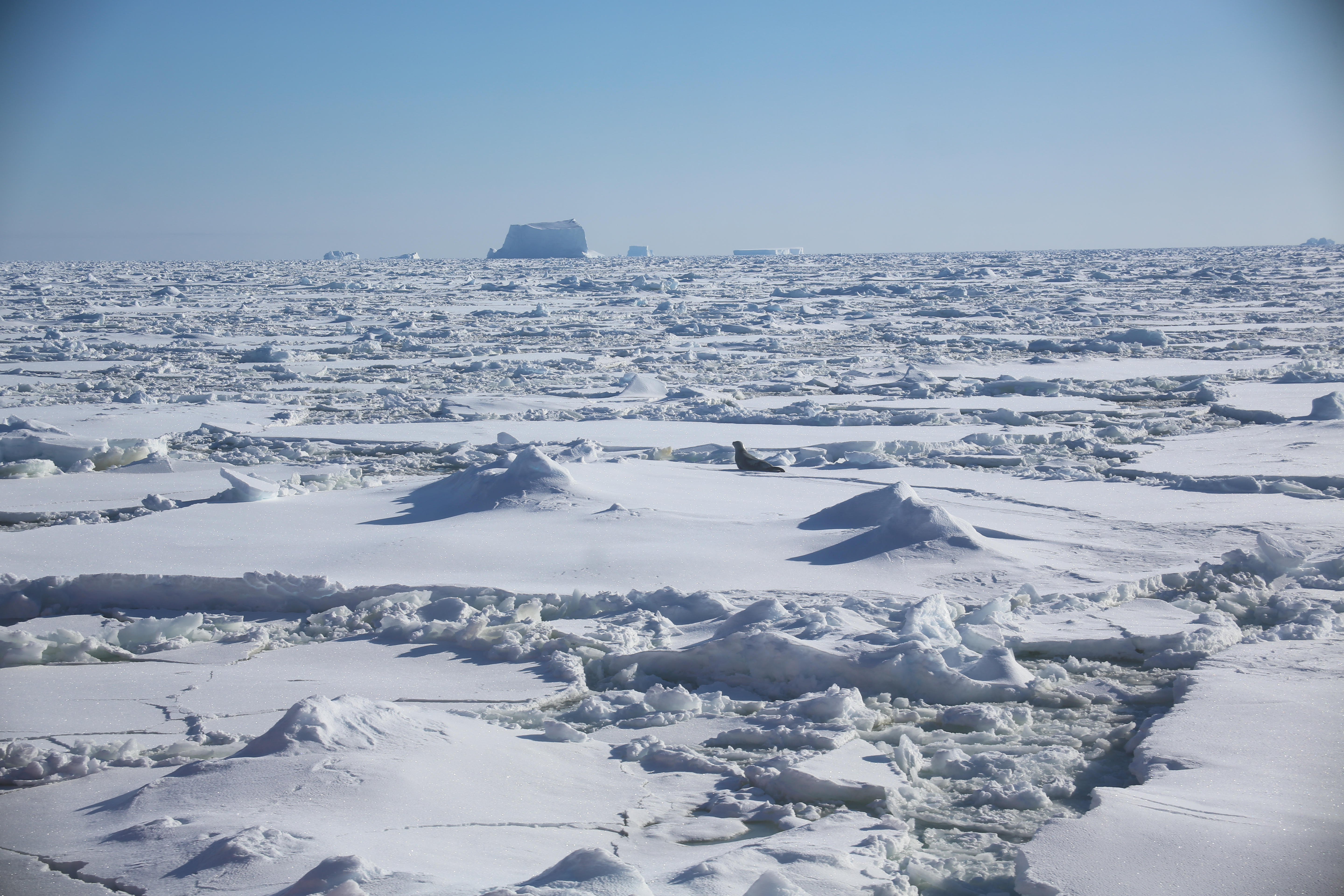 A crabeater seal moves away from the R/V Nathaniel B. Palmer icebreaker in the Amundsen Sea.