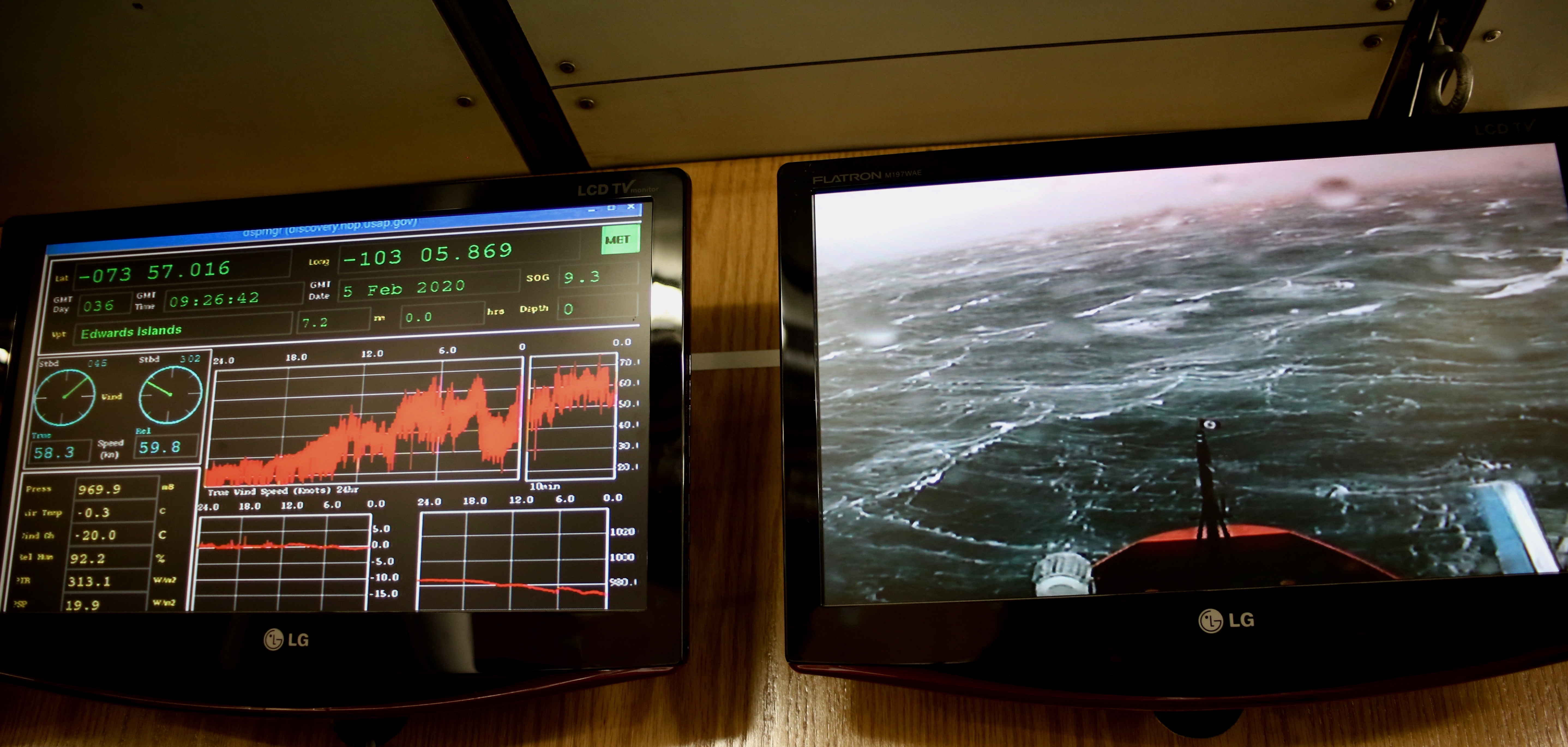 Side-by-side screens on the Nathaniel B. Palmer reveal high winds and rough waters during an intense storm. Aboard the R/V Nathaniel B. Palmer icebreaker in the Southern Ocean.