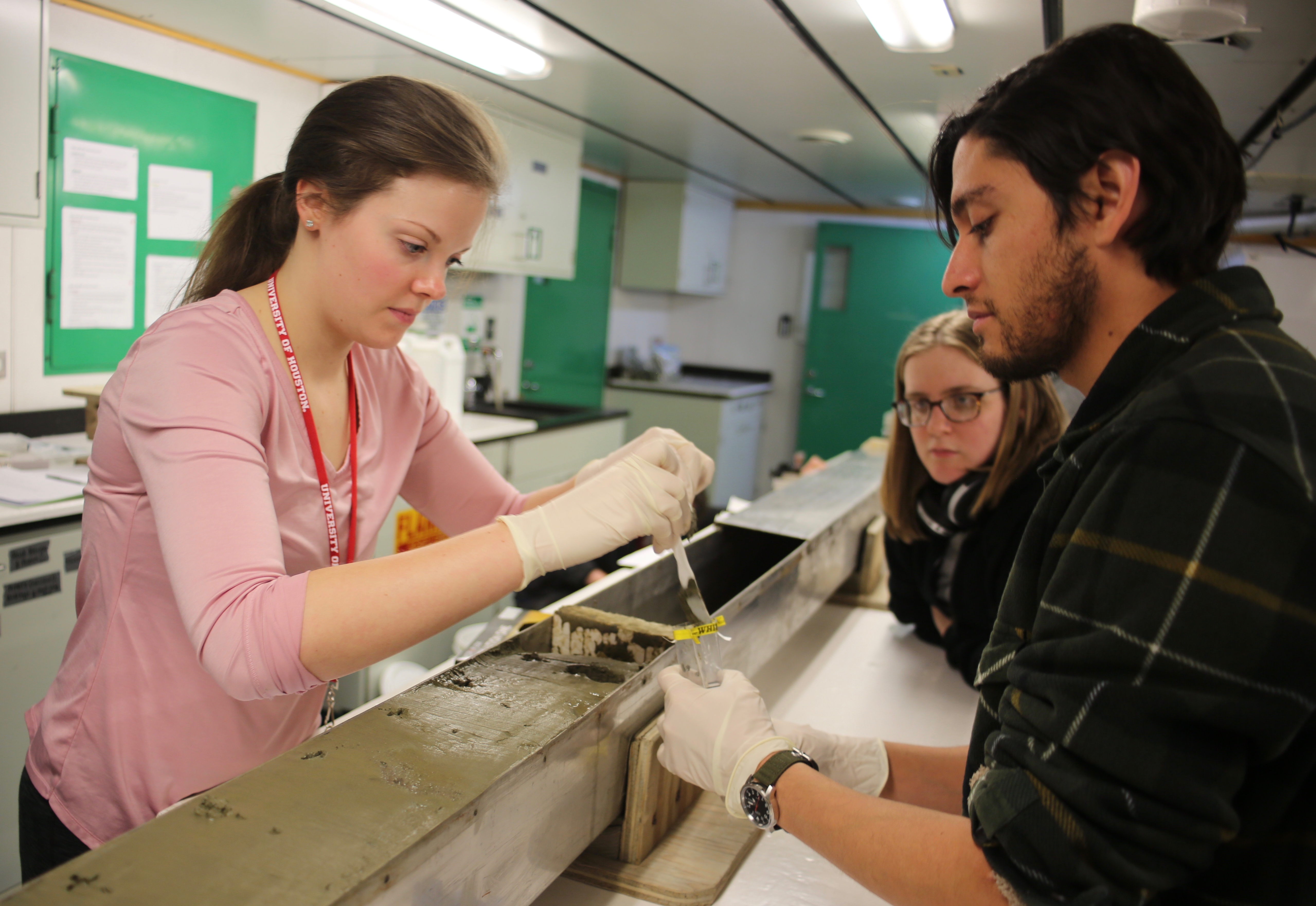 Graduate students Rachel Clark and Santiago Munevar begin the extensive process of collecting samples from a Kasten core, while Lily Dove observes. Aboard the R/V Nathaniel B. Palmer icebreaker in the Southern Ocean.