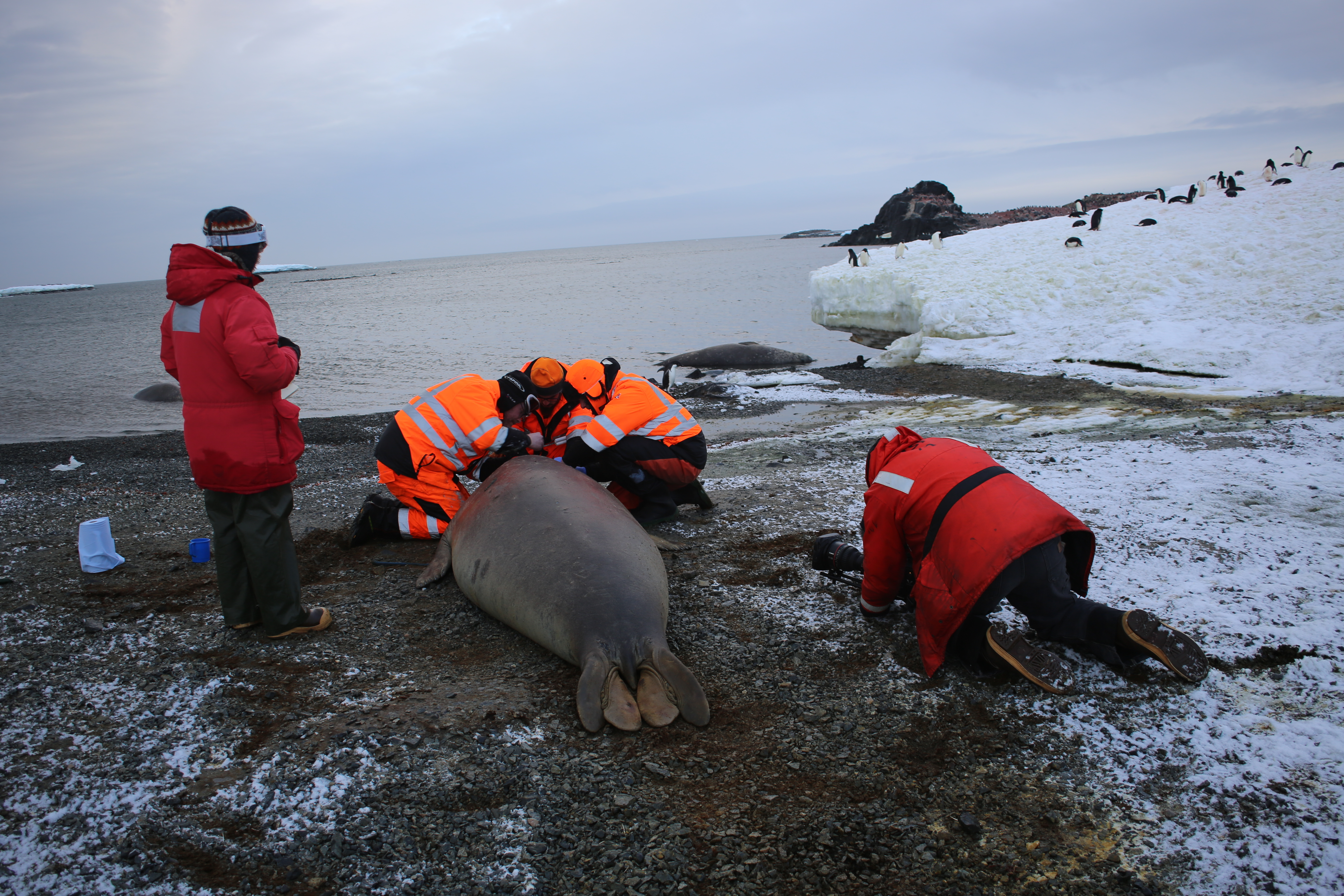 The seal tagging team uses a strong epoxy to attach a tag to the hair of an elephant seal on Edwards Islands #4 (Permit FCO No. 03/2019-20). Edwards Islands #4, Amundsen Sea, Antarctica.
