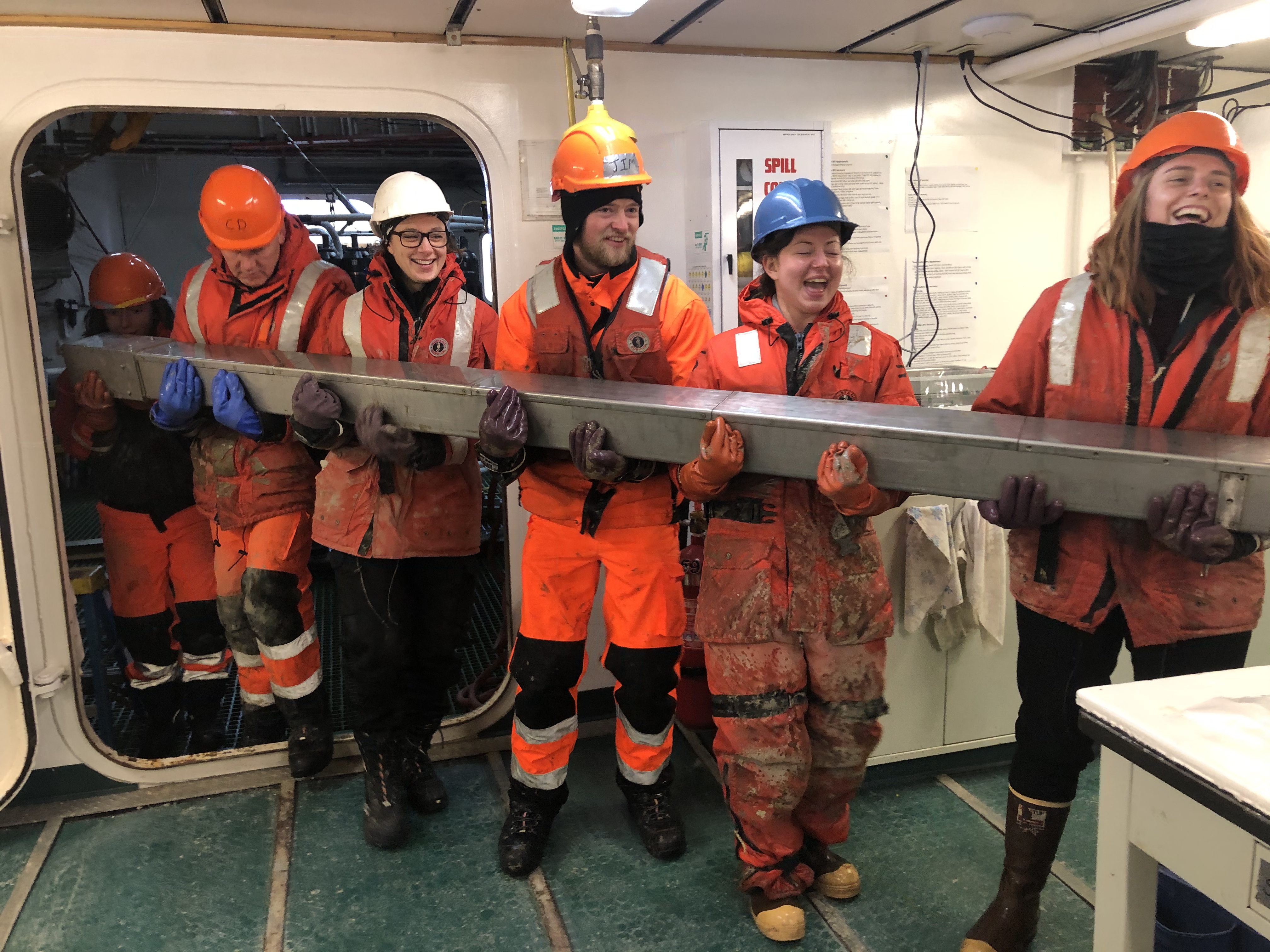It takes multiple people to carry a full Kasten core from the deck into the lab. Aboard the R/V Nathaniel B. Palmer icebreaker in the Southern Ocean.