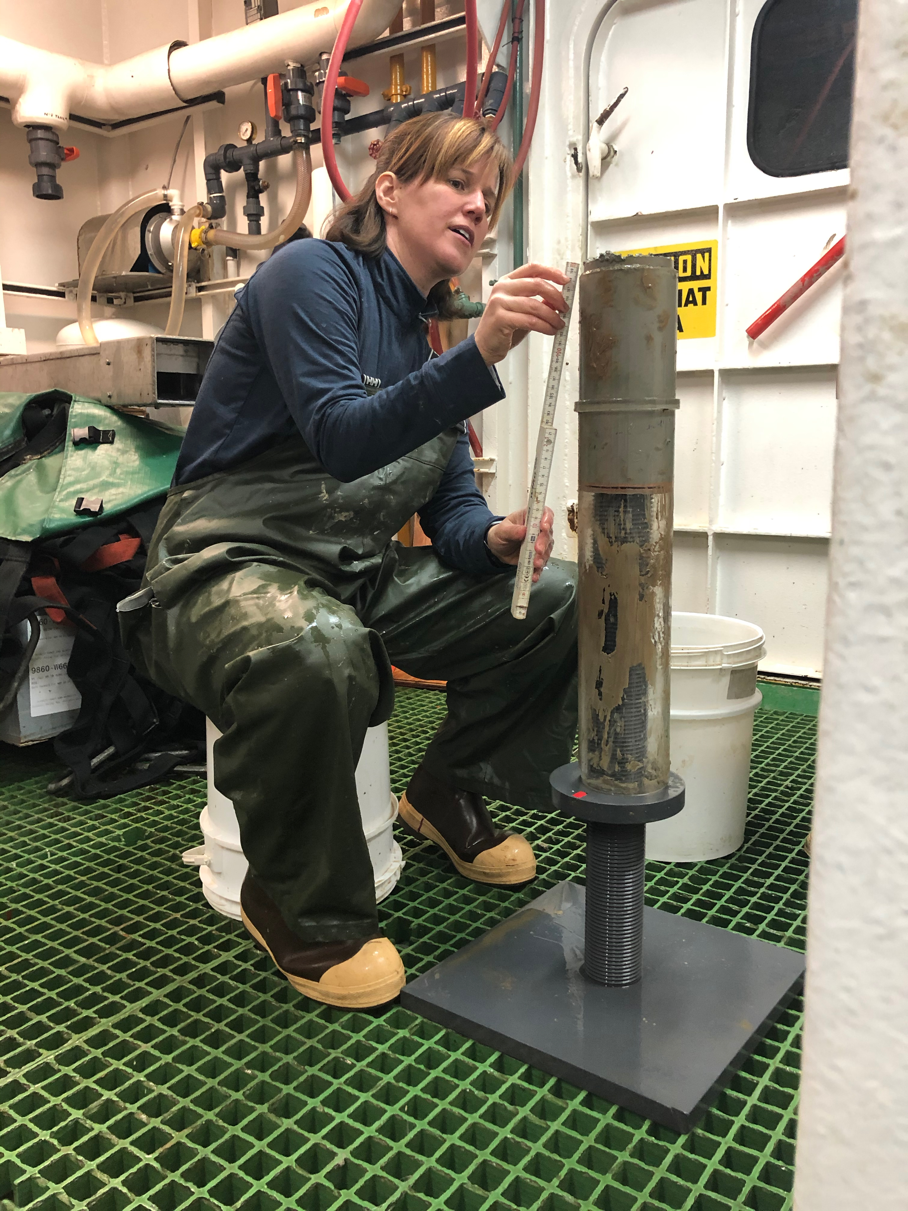 Sarah Slack helps to process the sediment captured in a megacore tube. Aboard the R/V Nathaniel B. Palmer icebreaker in the Southern Ocean.