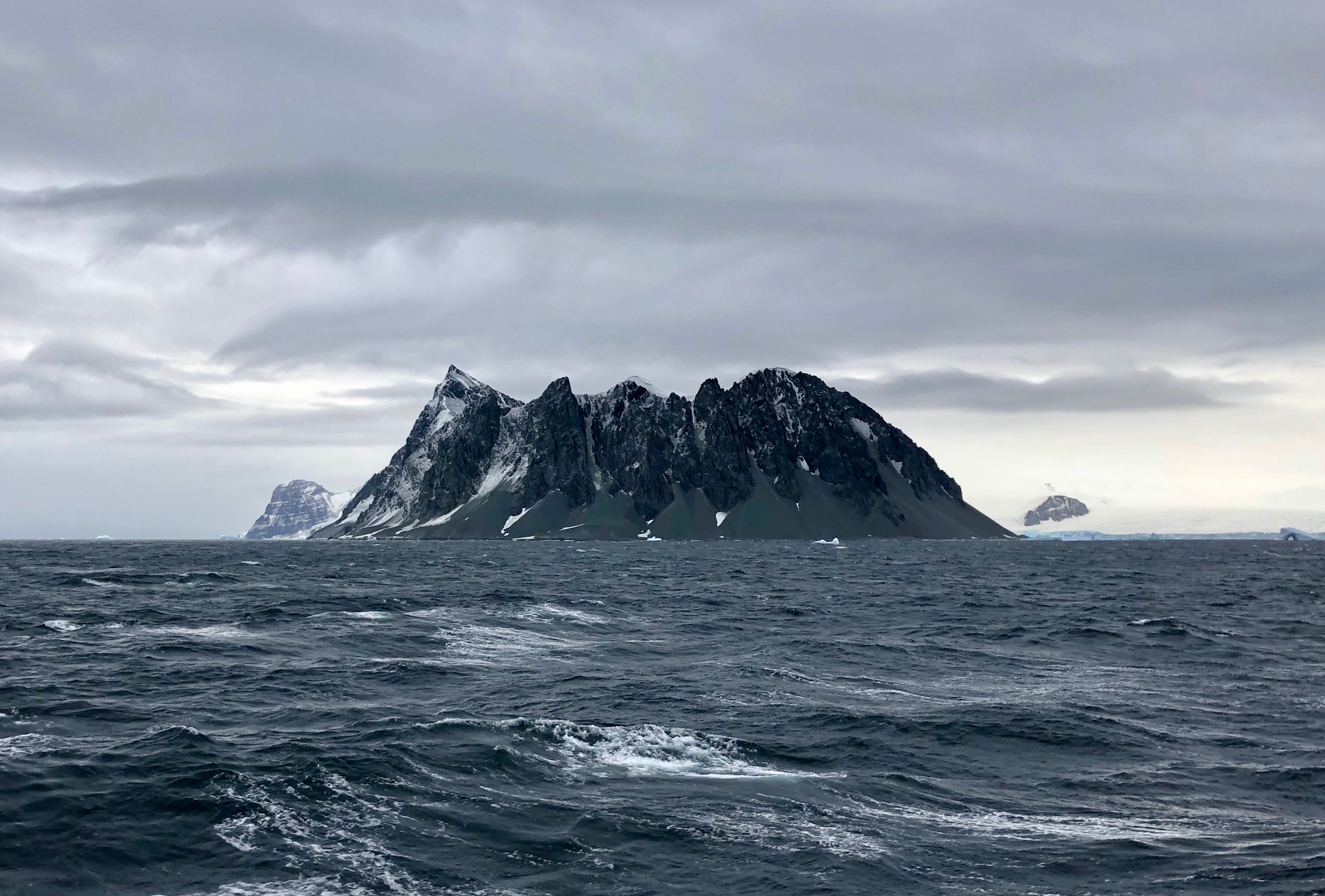Rocky cliffs at the edge of the Antarctica Peninsula are seen on the ship's journey north to Chile. Aboard the R/V Nathaniel B. Palmer icebreaker in the Southern Ocean.