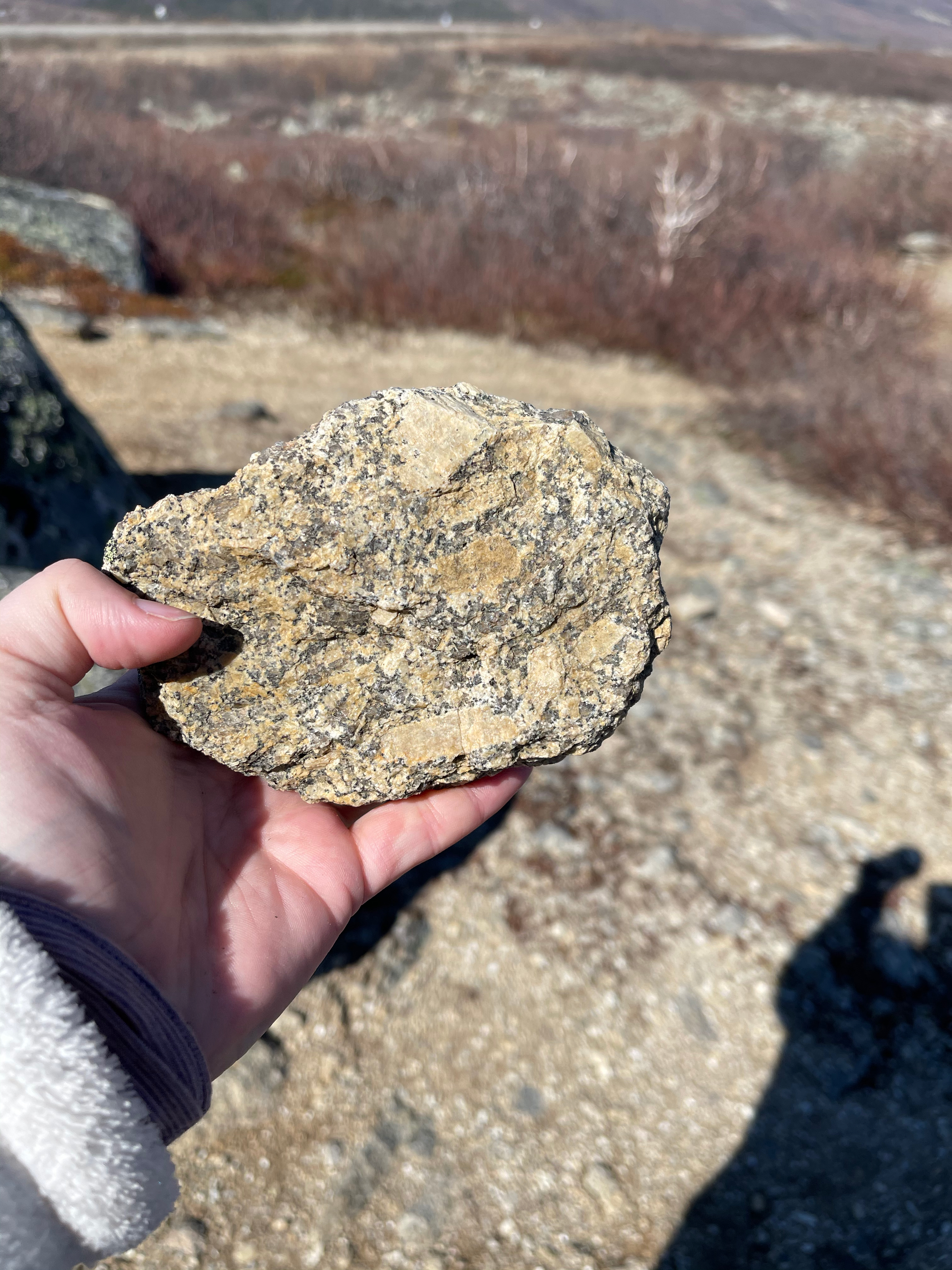 Liza Backman holds a granite sample with large phenocrysts at Finger Mountain, on the Dalton Highway, Alaska.
