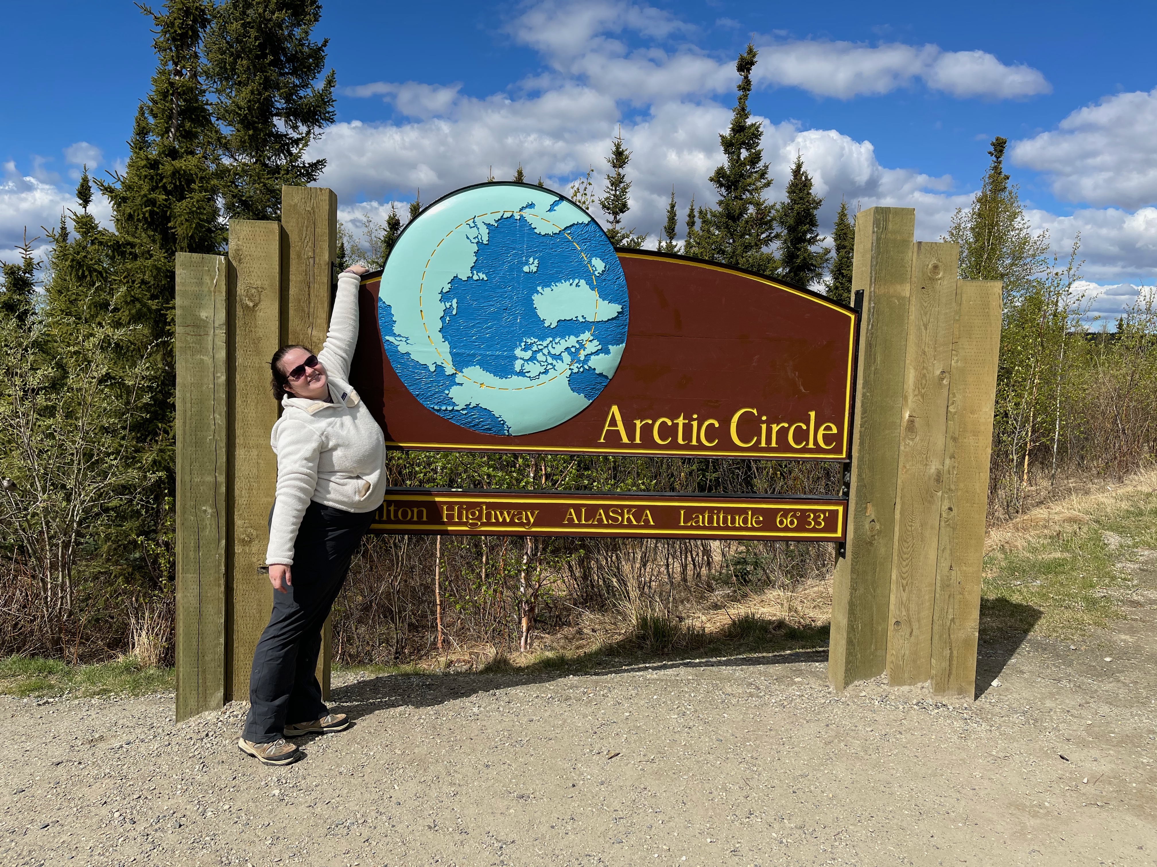 Liza Backman stands in front of the Arctic Circle sign as she and the team head towards Toolik Field Station. Dalton Highway, Alaska.