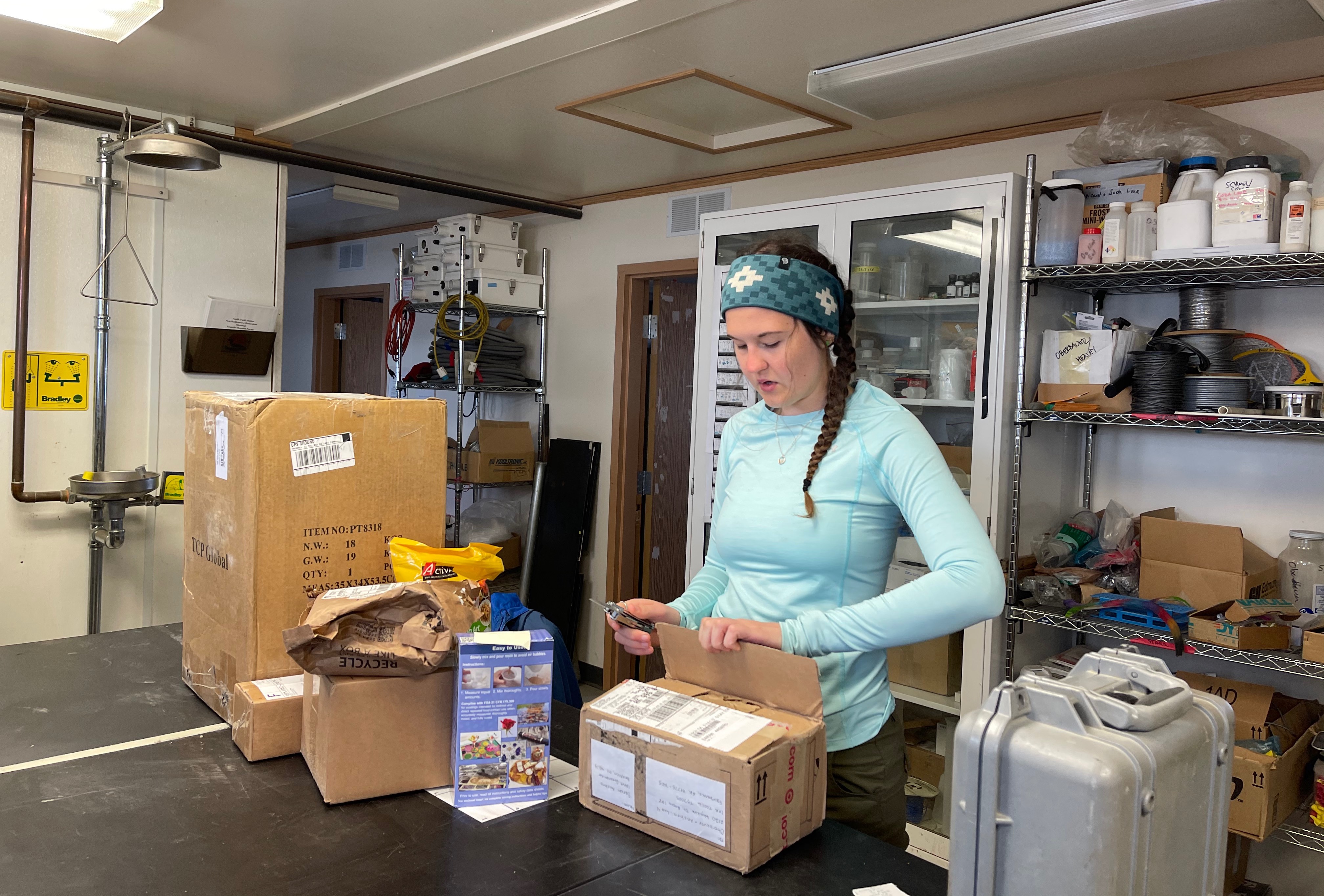 Sarah Ansbro unboxes packages in the lab to prepare for the field season. Toolik Field Station, Alaska.
