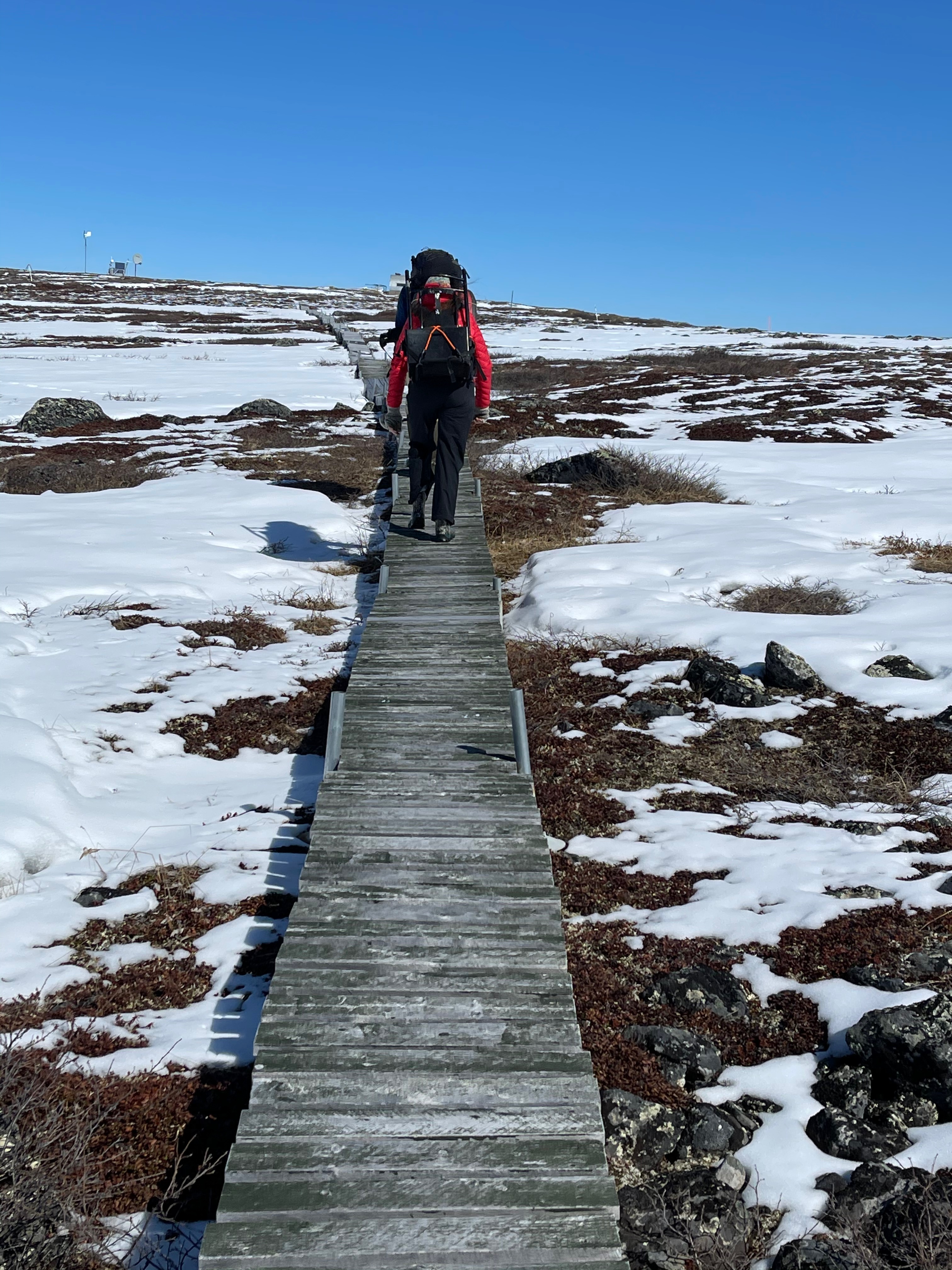Sarah Ansbro walks along the Imnavait boardwalk carrying a dead 12V battery that she is taking back for recharging. Imnavait site, near Toolik Field Station, Alaska.
