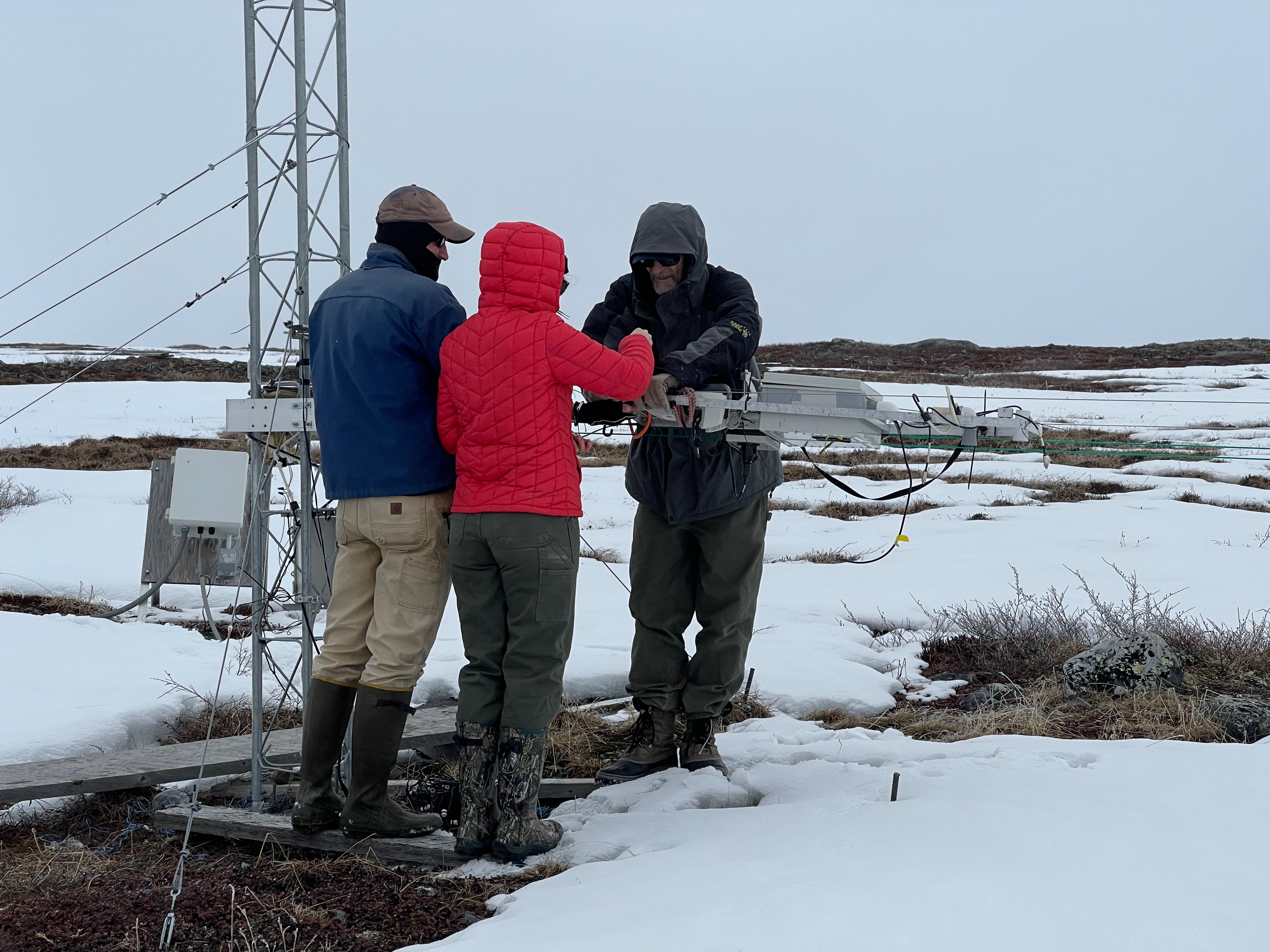 Steve Oberbauer, Sarah Ansbro, and Jeremy May hang the MISP (Mobile Instrumented Sensor Platform) on the cables in a snowy landscape. Imnavait site, near Toolik Field Station, Alaska.