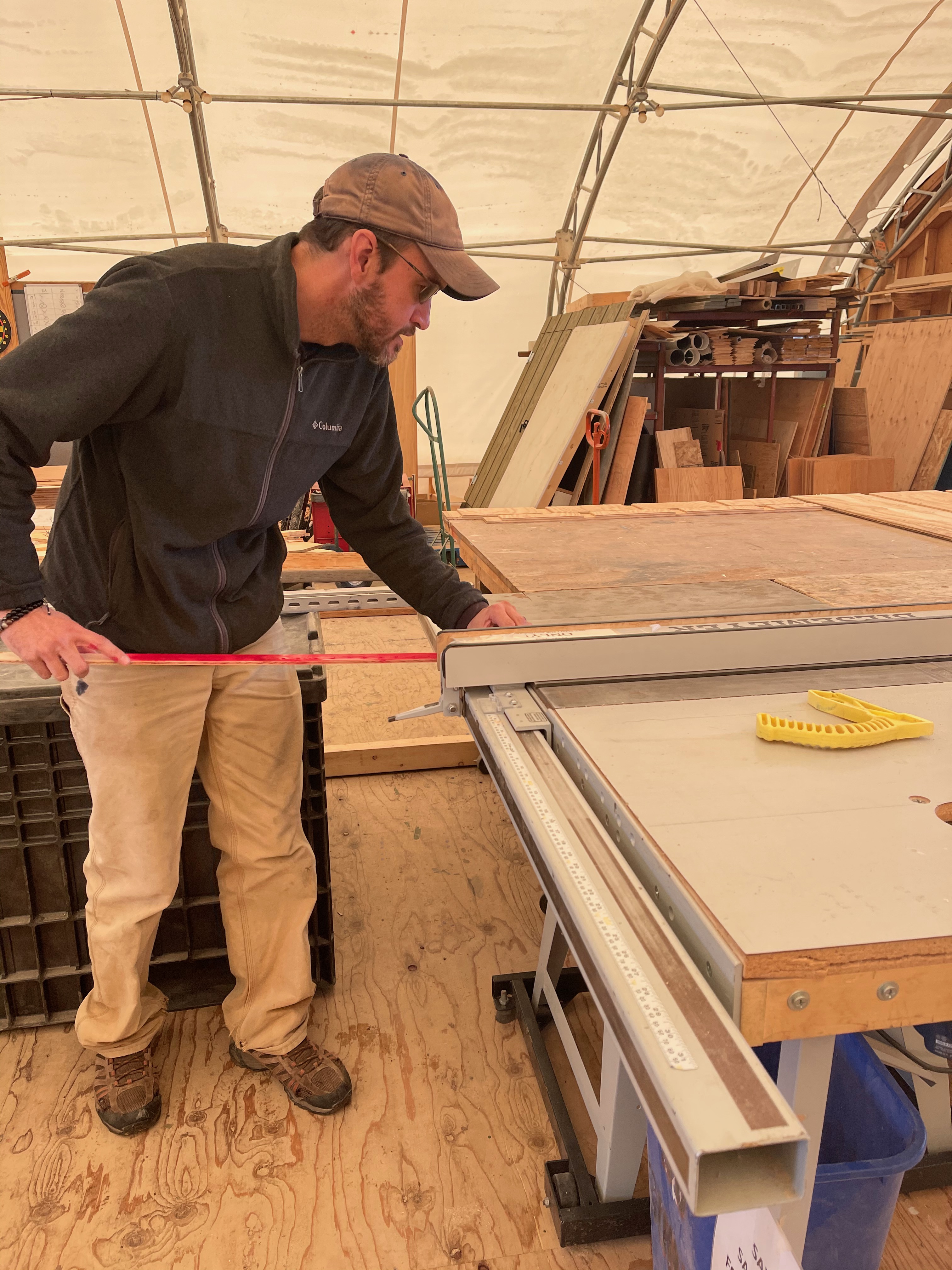 Jeremy May cuts up spray painted wood to use as thaw depth markers for the seasons plots. Toolik Field Station, Alaska.