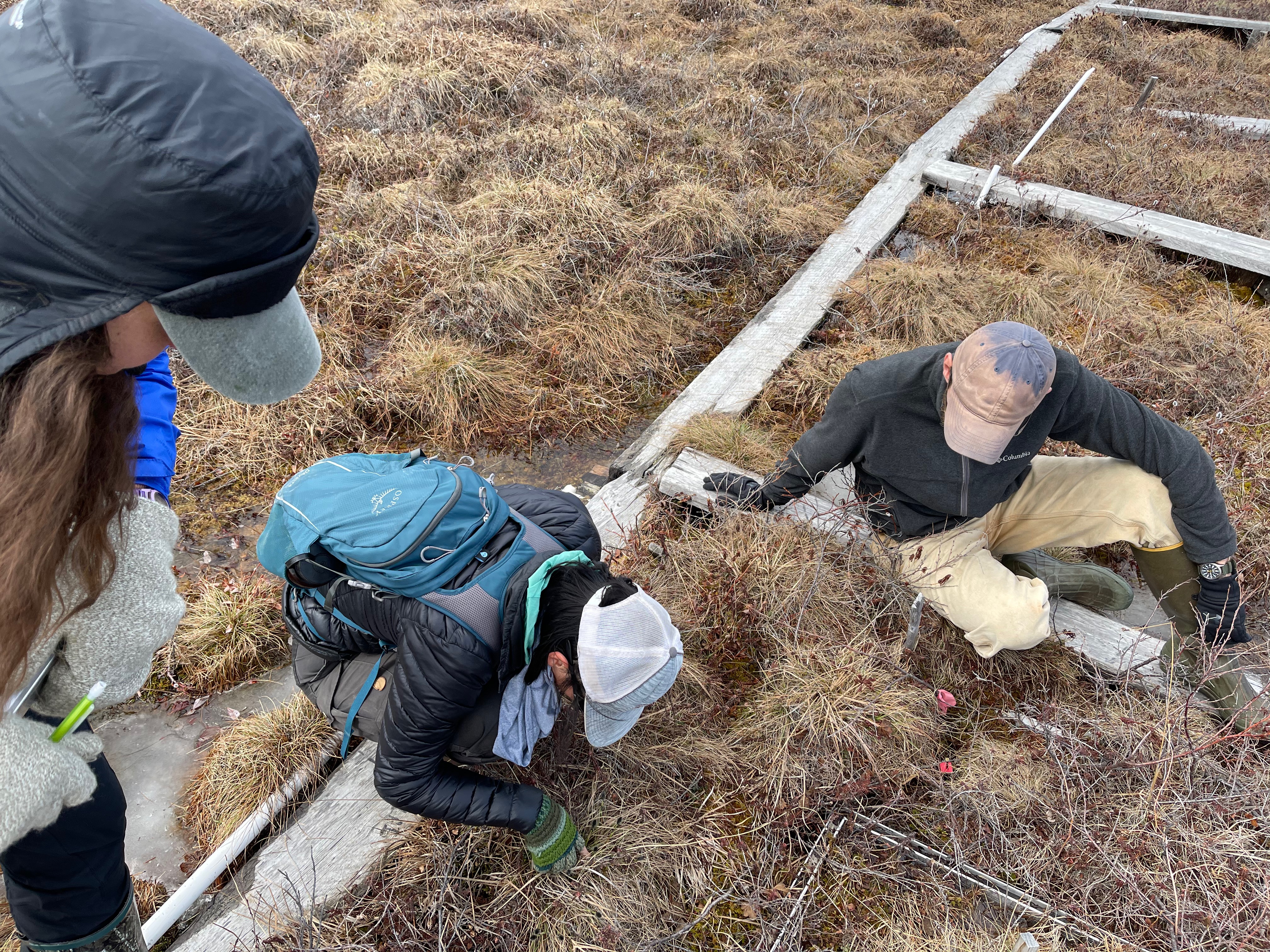Ruby An and Jeremy May dig into the plot while Sarah Ansbro records the data that they collect. Toolik Field Station, Alaska.