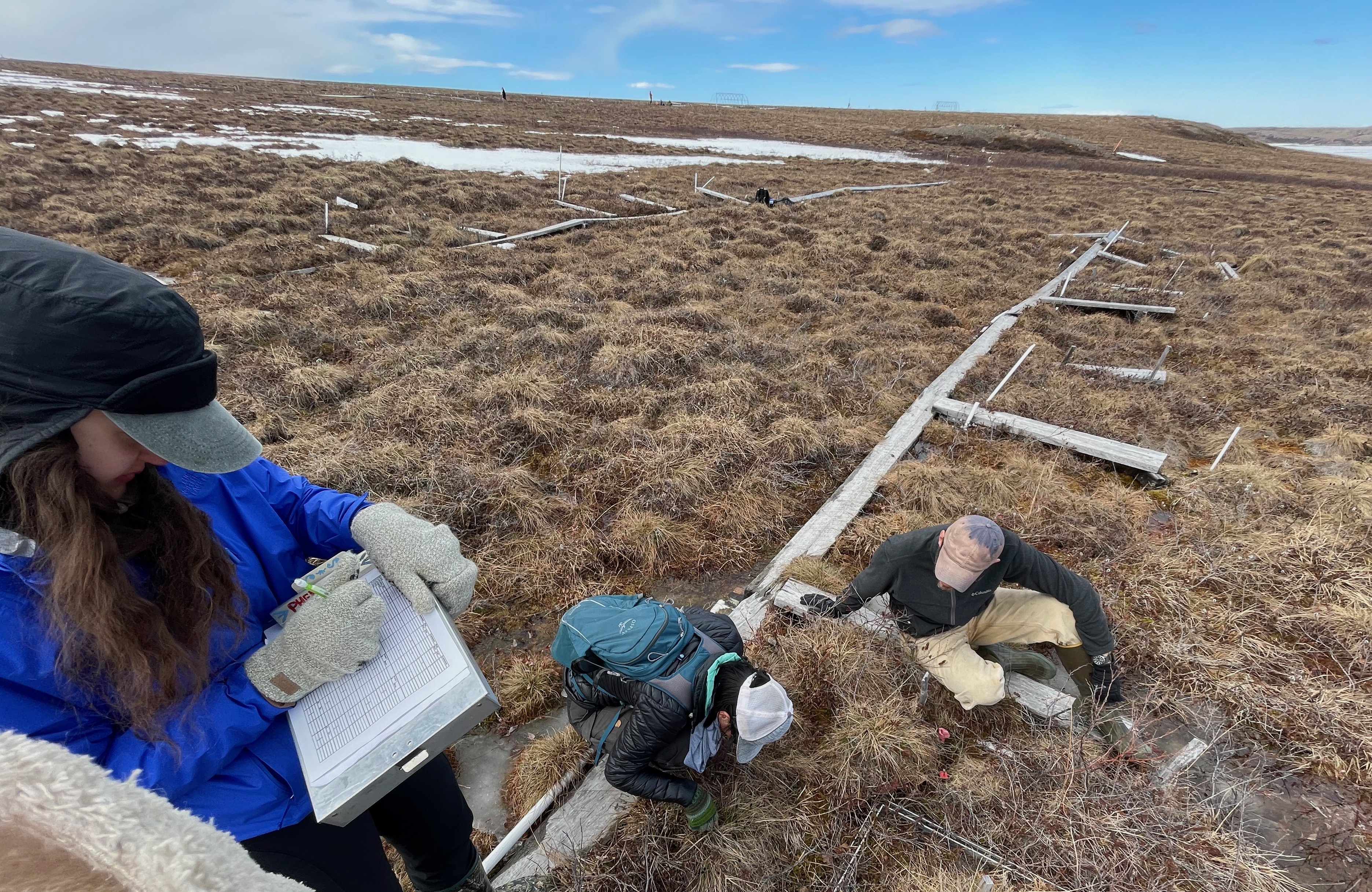 Sarah Ansbro records phenological data from Ruby An and Jeremy May at the seasons control plots. Toolik Field Station, Alaska.
