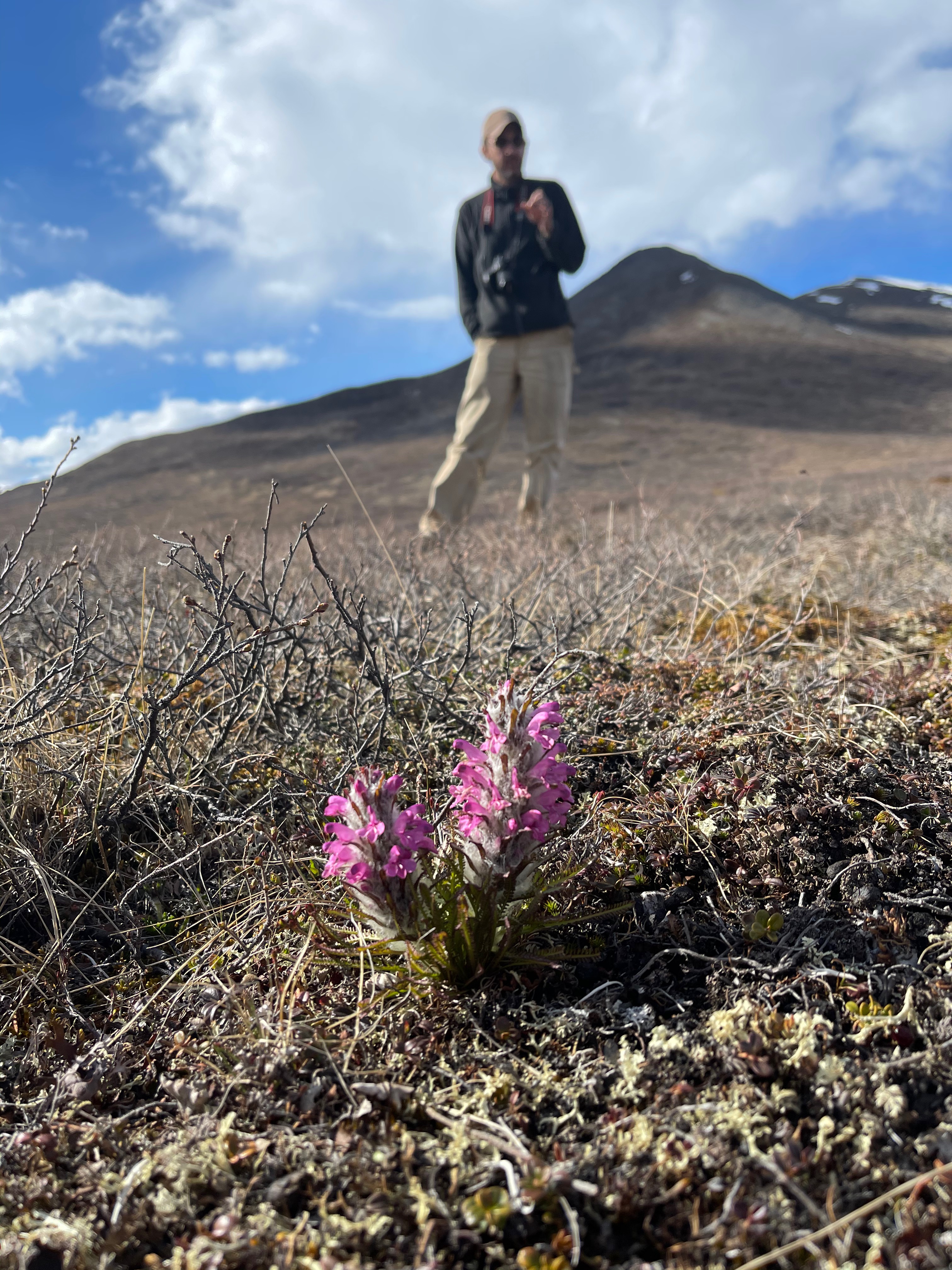 Jeremy May stands behind a flowering Pedicularis. Chandalar Shelf, Dalton Highway, Alaska.