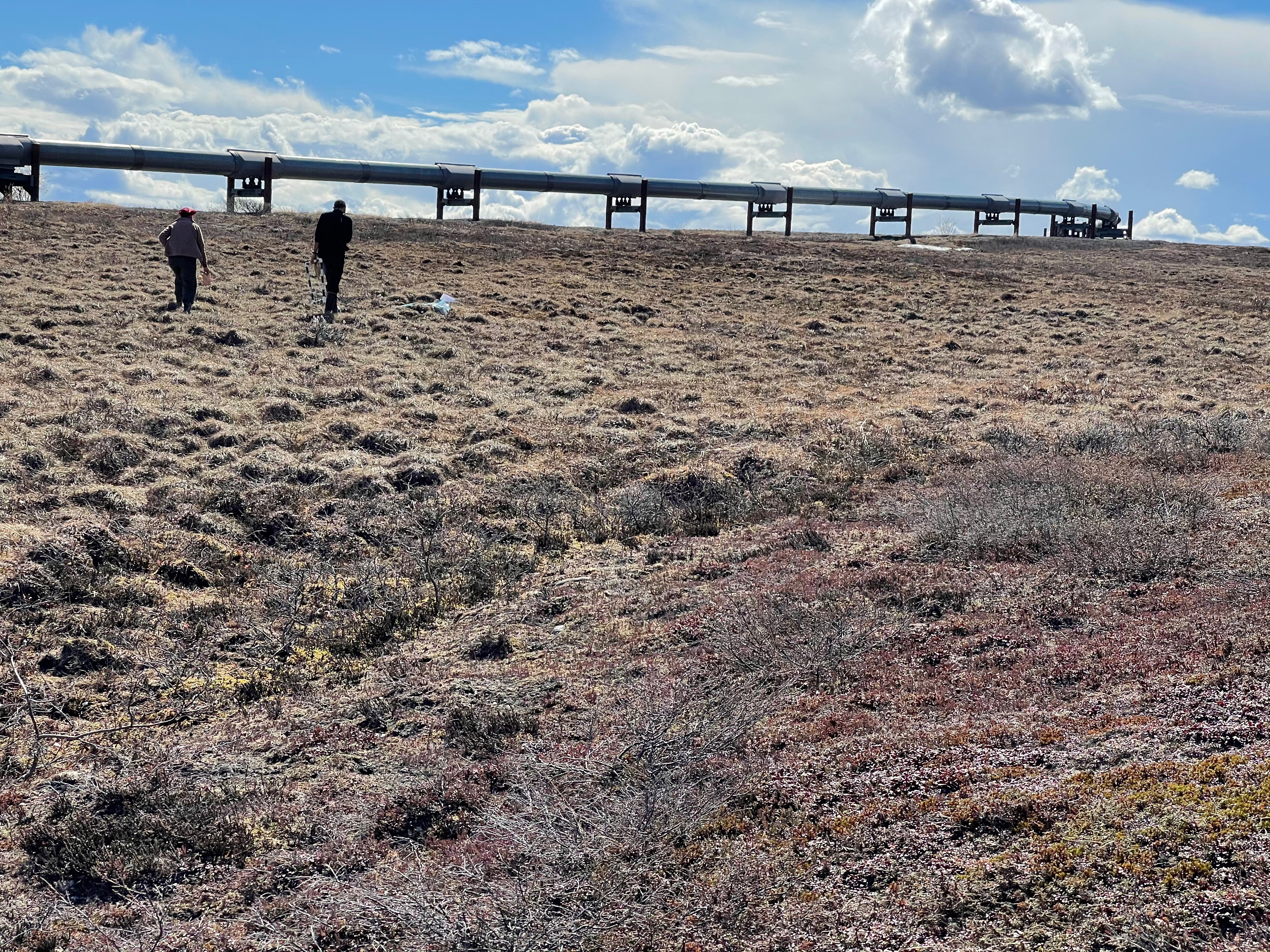 Jeremy May and Sarah Ansbro walk towards the Trans-Alaska Pipeline on the way back from collecting berries at Slope Mountain, Alaska.