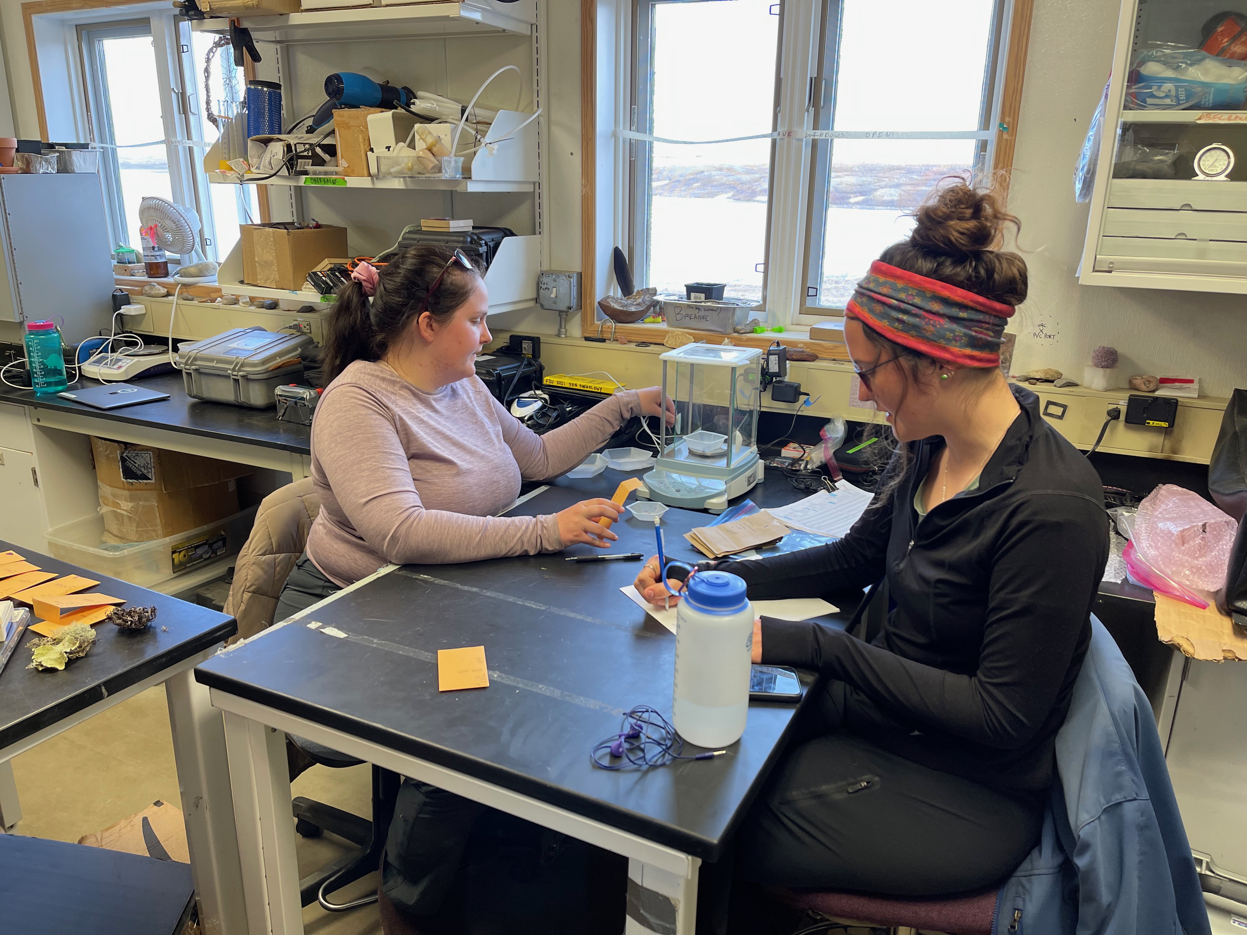Liza Backman and Sarah Ansbro weigh and measure berries harvested for the annual spring berry survey. Toolik Field Station, Alaska.