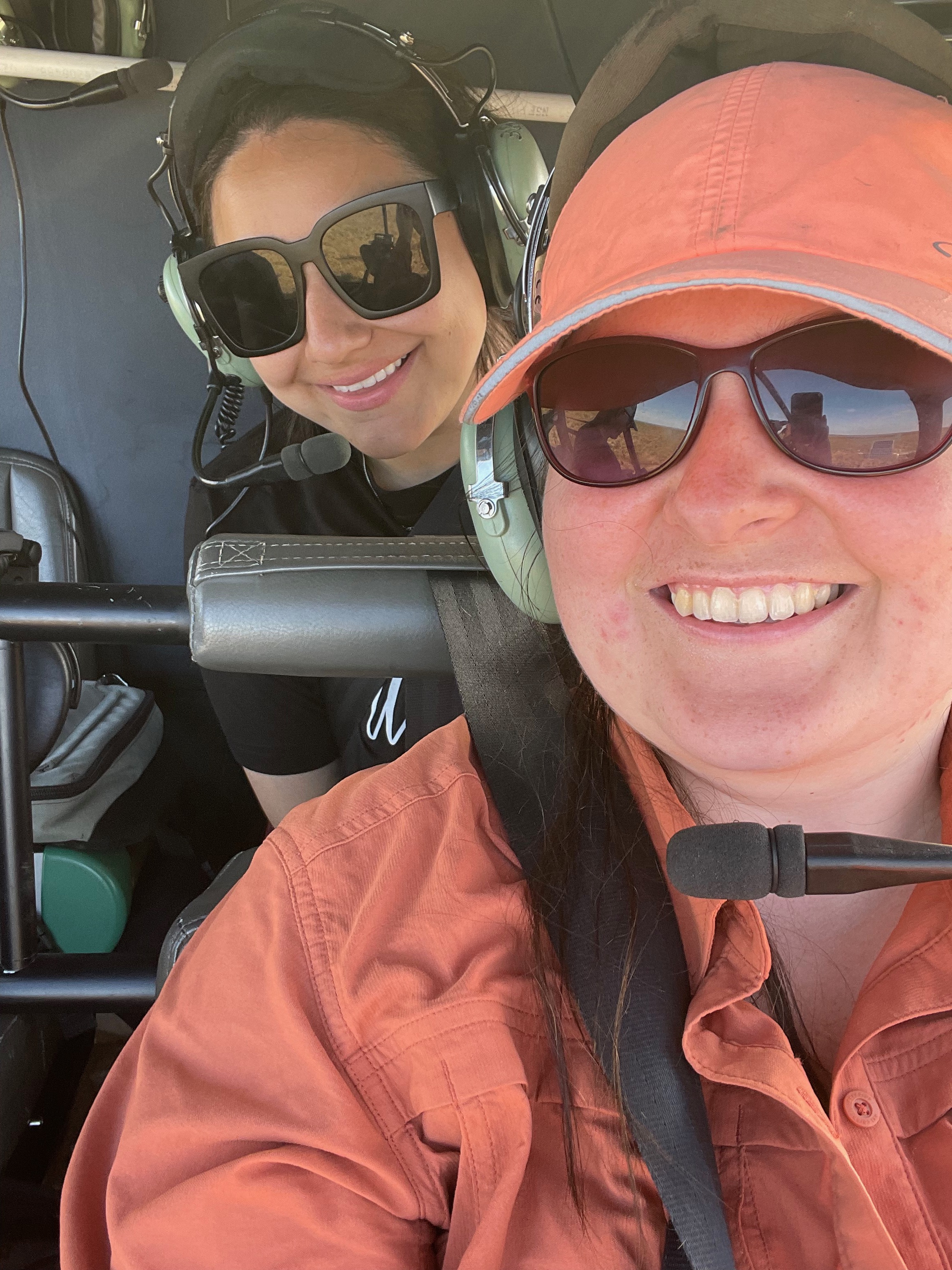 Lexy Salinas and Liza Backman sit inside a helicopter on the way back from the Anatuvuk burn site, outside Toolik Field Station, Alaska.