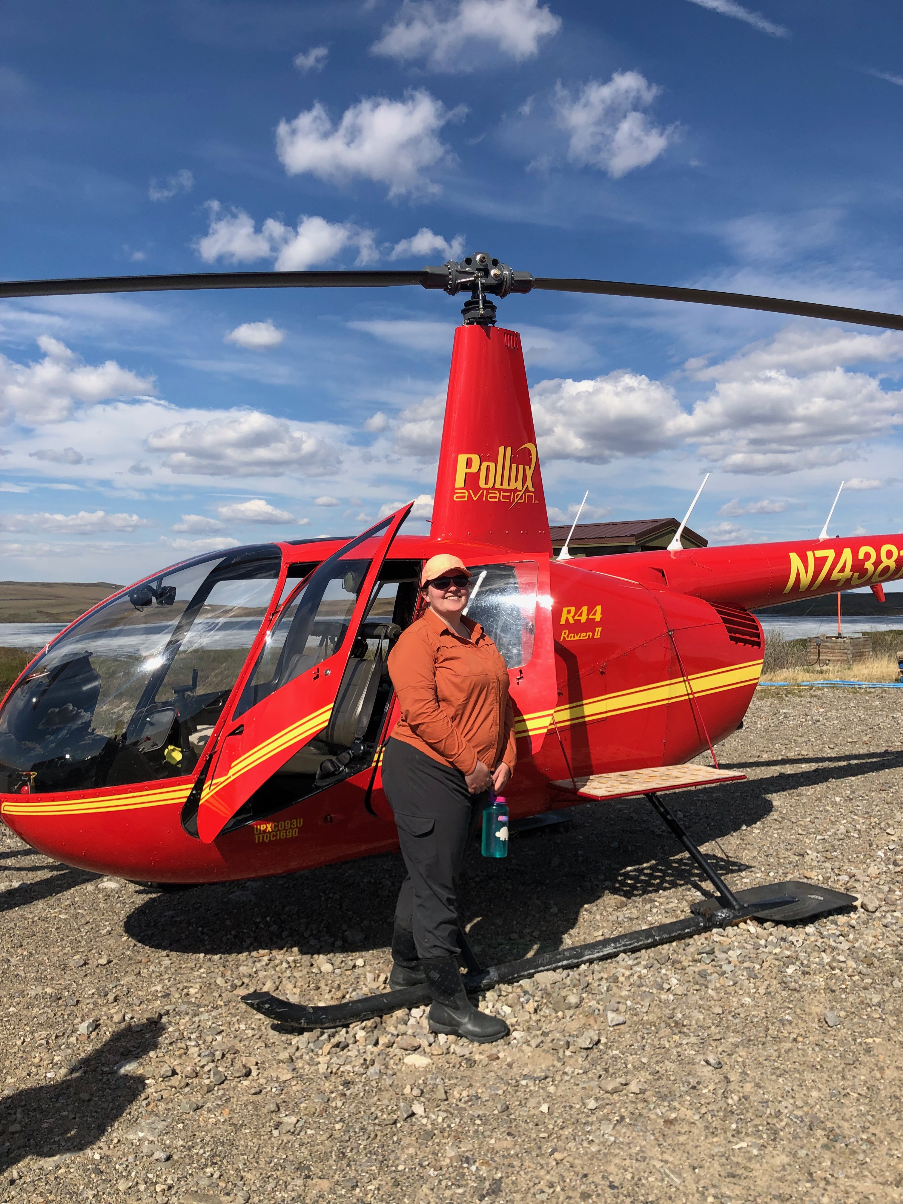 Liza Backman stands in front of a red helicopter that is used to go to remote locations. Toolik Field Station, Alaska.