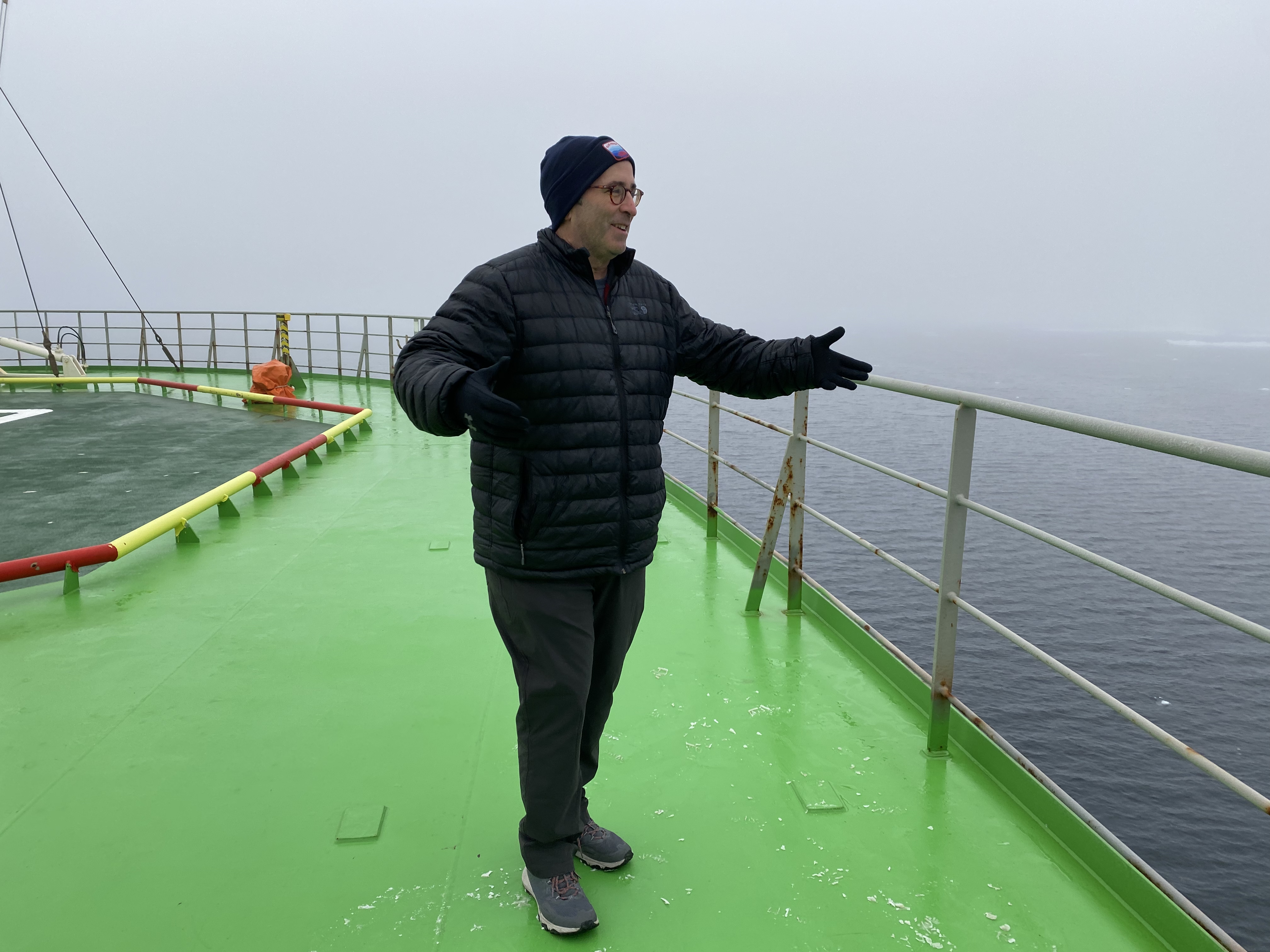 Jon Pazol stands on the bow of the Akademik Tryoshnikov pantomiming a remote geography lesson to share with his students. Aboard the Akademik Tryoshnikov in the Barents Sea.