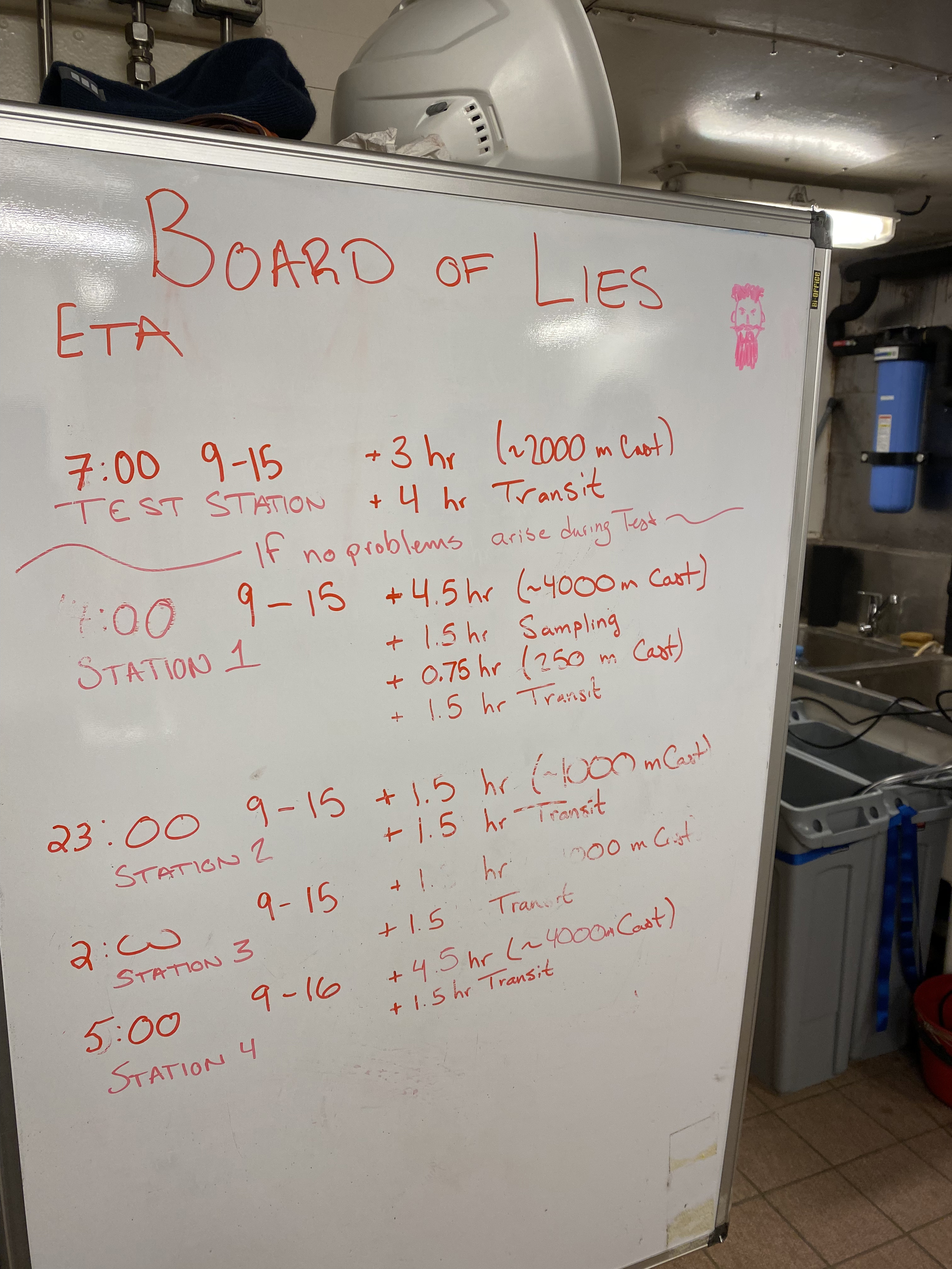 The Board of Lies aboard the Akademik Tryoshnikov, listing the dates and times of sampling stations. Aboard the Akademik Tryoshnikov in the Laptev Sea.