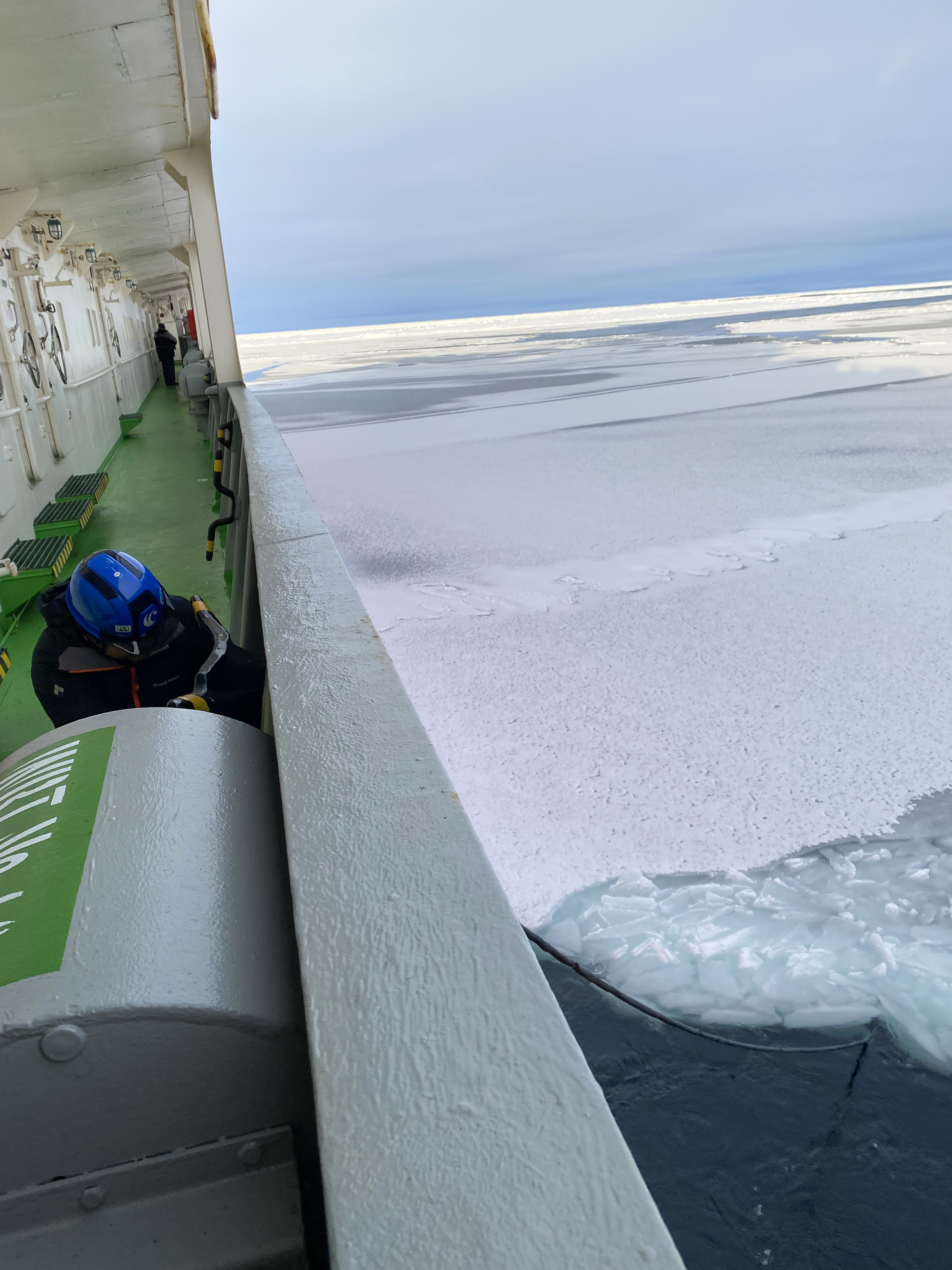 Water samples are taken from the deck with a hose placed just under the surface of the sea ice. Aboard the Akademik Tryoshnikov in the Laptev Sea.