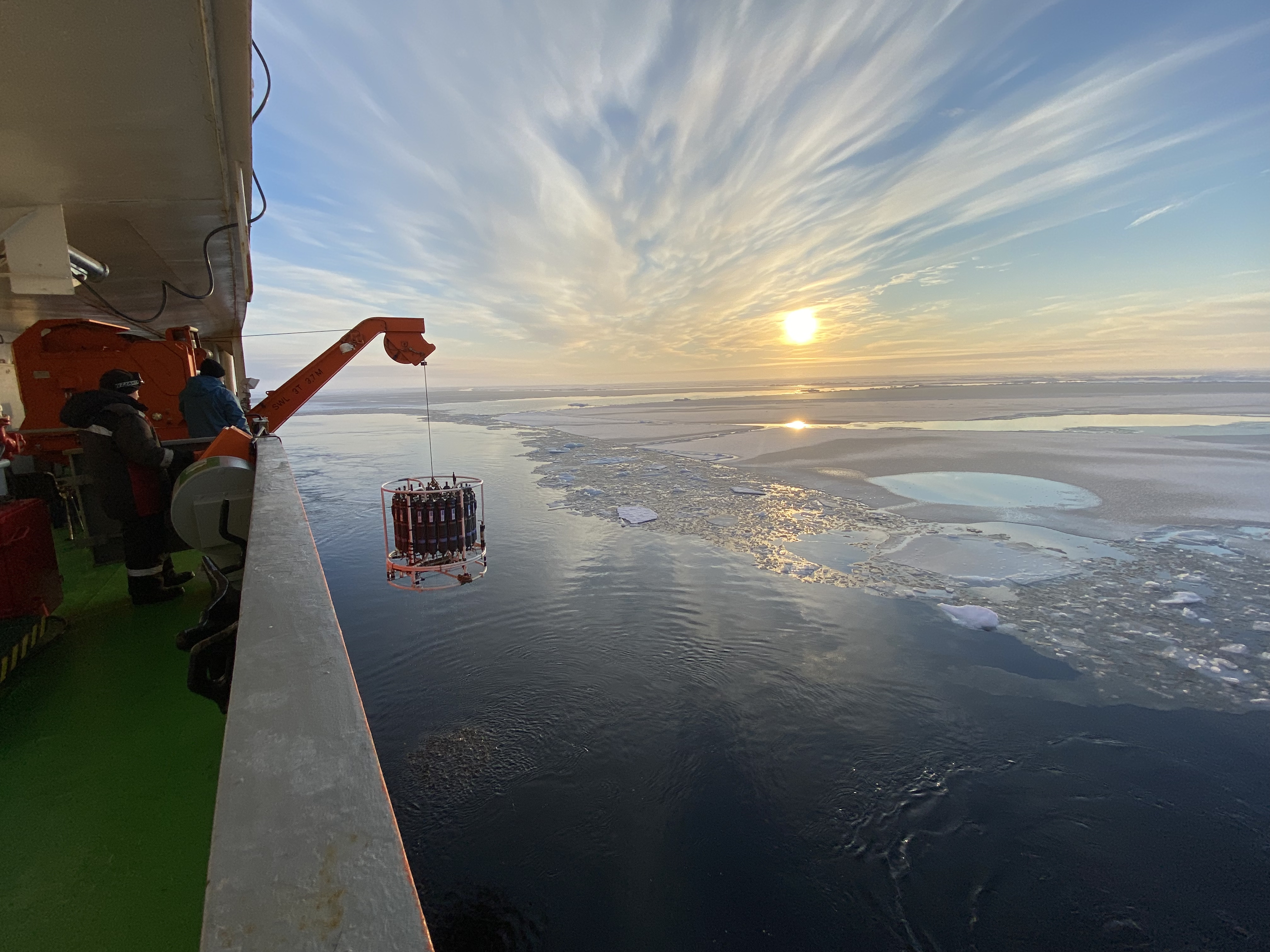 The rosette is lowered over the side of the Akademik Tryoshnikov during a dramatic Arctic sunset in the Laptev Sea.