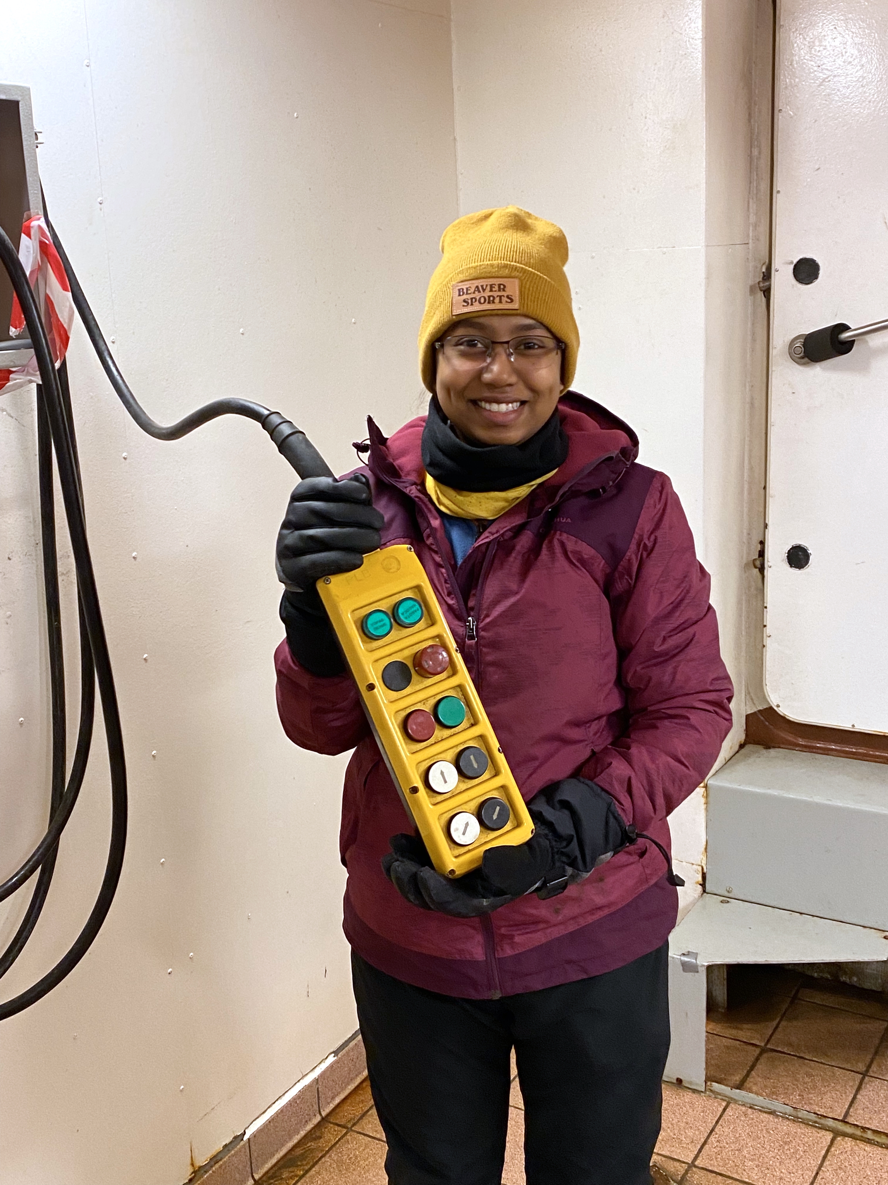 UAF graduate student Dolly More shows off the controller for the CTD (Conductivity, Temperature, and Depth instrument) cast. Aboard the Akademik Tryoshnikov in the Laptev Sea.