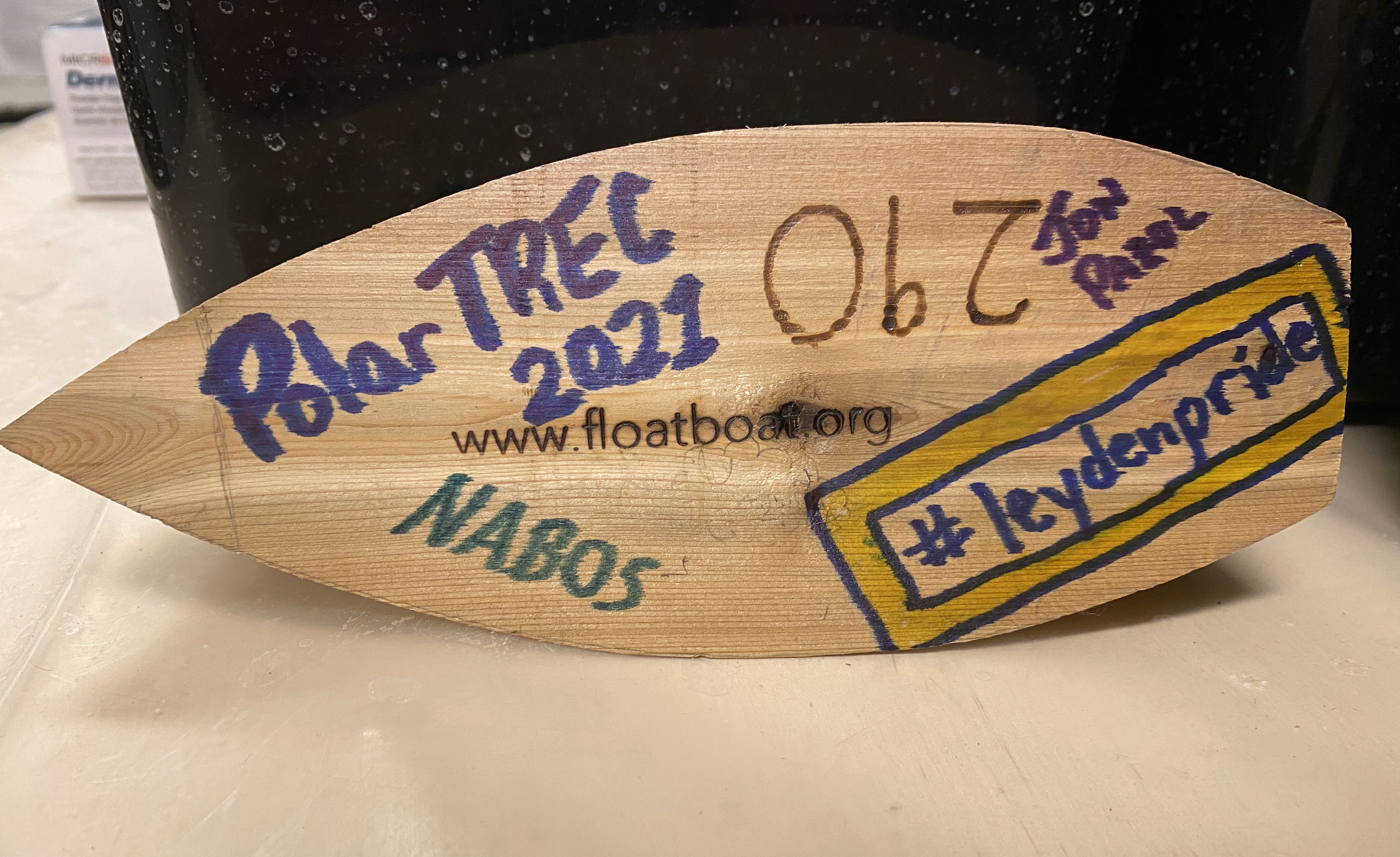 A wooden boat made for the Float Your Boat project decorated by Jon Pazol for PolarTREC and West Leyden High School. Aboard the Akademik Tryoshnikov in the East Siberian Sea.