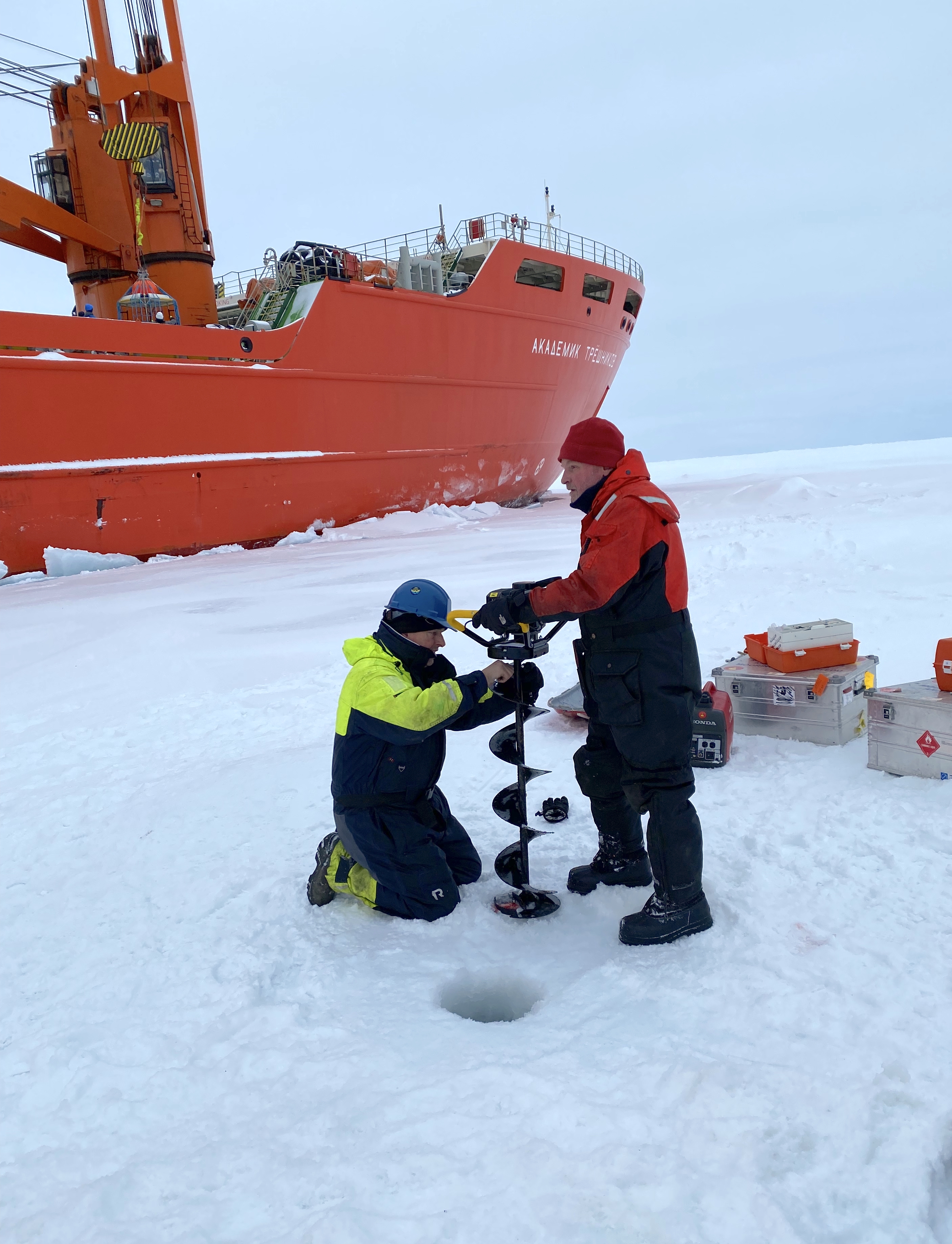 WHOI (Woods Hole Oceanographic Institution) technicians Jim Dunn and John Kemp drill into the thick sea ice of the East Siberian Sea, with the Akademik Tryoshnikov in the background.
