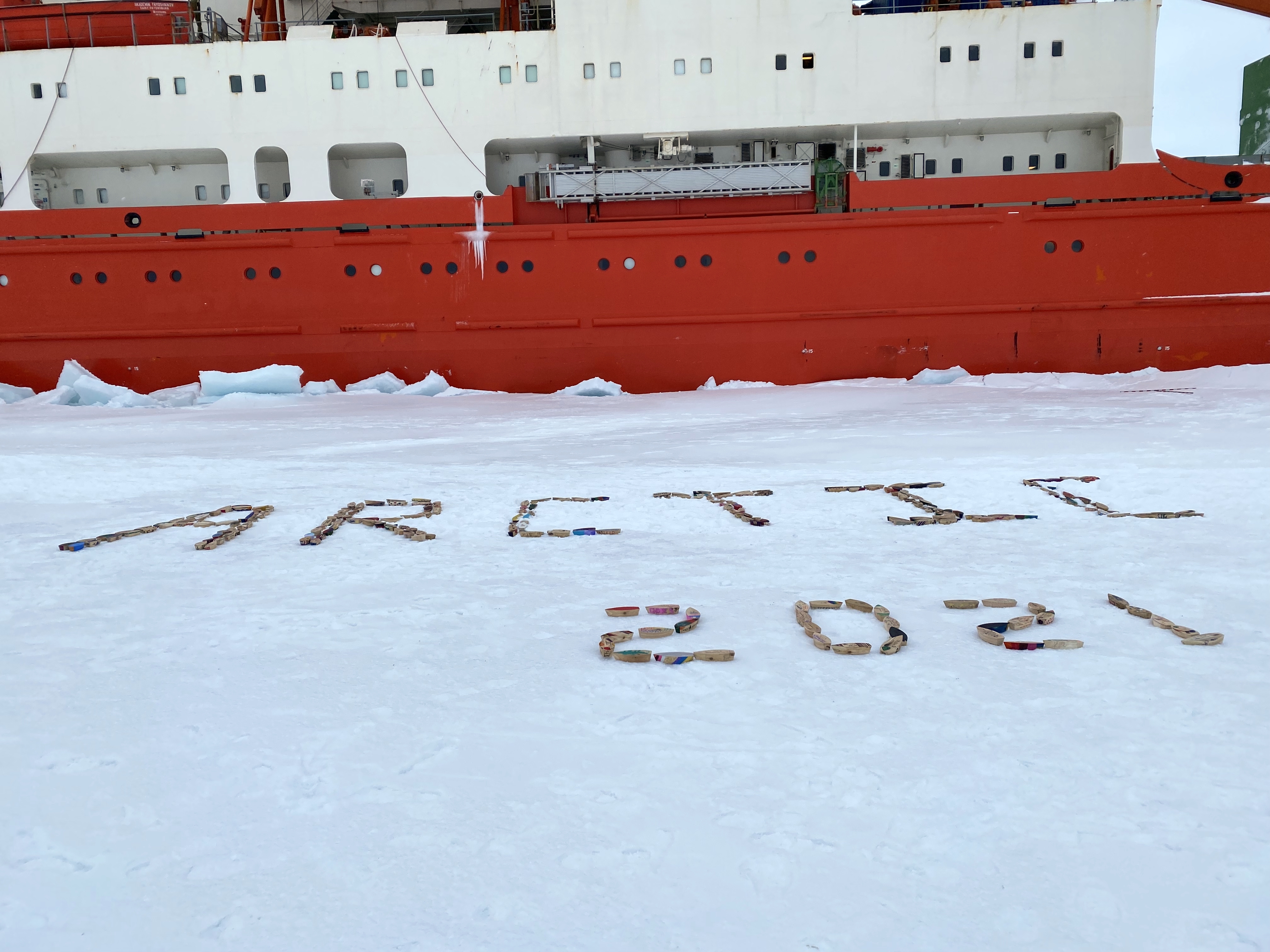 Wooden boats from the Float Your Boat project are arraged to spell out 'Arctic 2021' as they are deployed onto the sea ice. On the sea ice of the East Siberian Sea near the Akademik Tryoshnikov.
